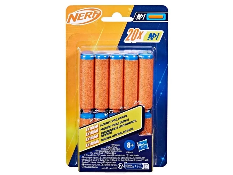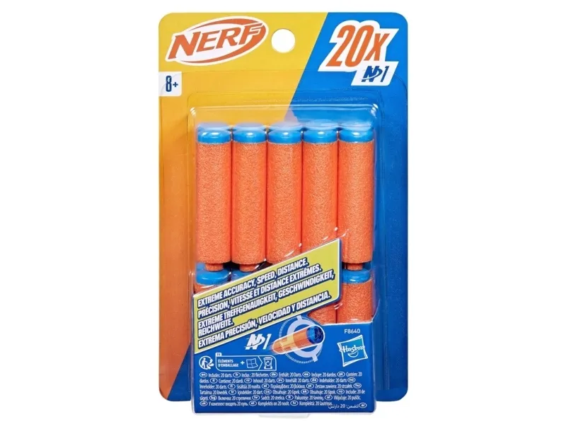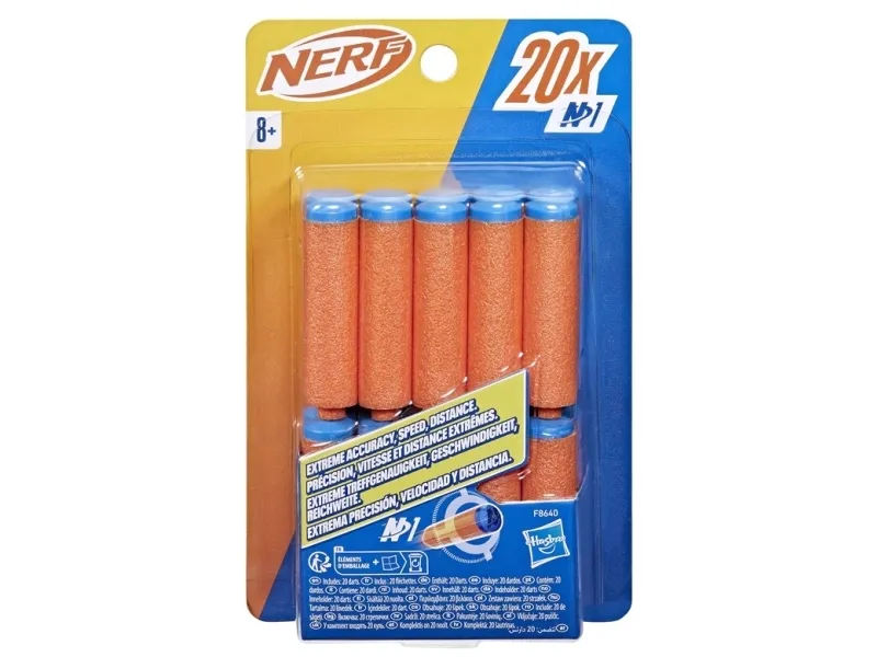 The Nerf brand levels up your game with high-performance Nerf N Series dart blasters and Nerf N1 darts! You have the skills as a Nerf battler, now you have the blasters and darts to gain a superior edge in indoor and outdoor play. From the creators of the foam dart, the Nerf brand unleashes the next evolution in foam dart blasting with Nerf N Series N1 darts, delivering EXTREME ACCURACY, SPEED, and DISTANCE! With Official Nerf N1 foam darts, you can fire into pulse-pounding fun as you get together with family and friends to play Nerf games. Send darts flying and feel the thrill as they go long and go far with supreme accuracy that lets you score big in battle. This pack includes 20 Nerf N Series N1 darts, compatible only with Nerf N Series blasters. Eyewear recommended (not included). Blasters sold separately, subject to availability.NERF and HASBRO and all related trademarks and logos are trademarks of Hasbro, Inc.