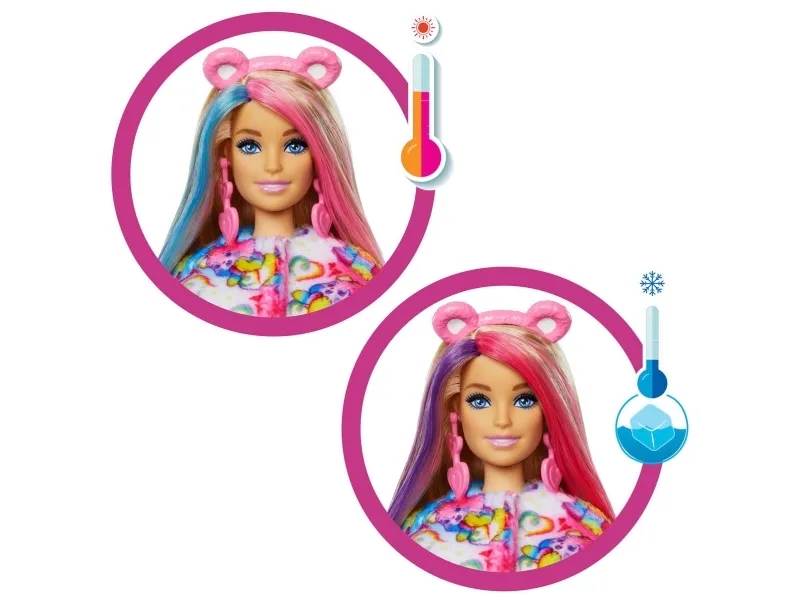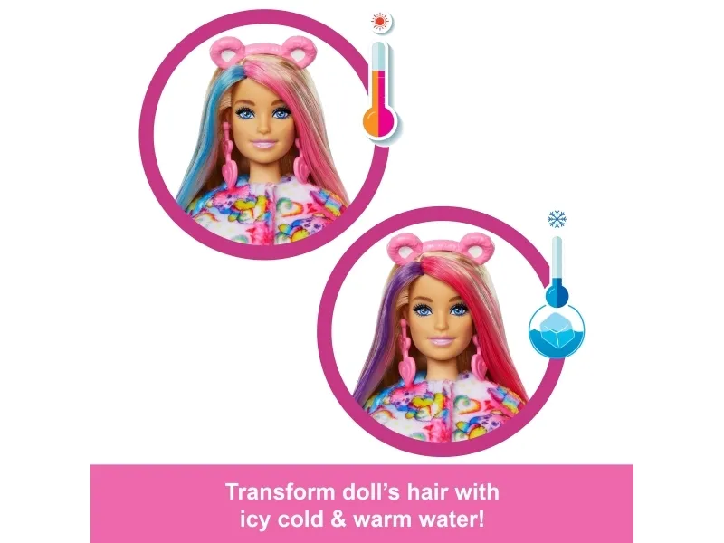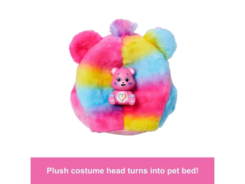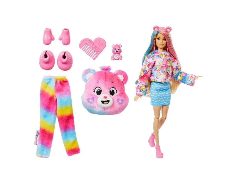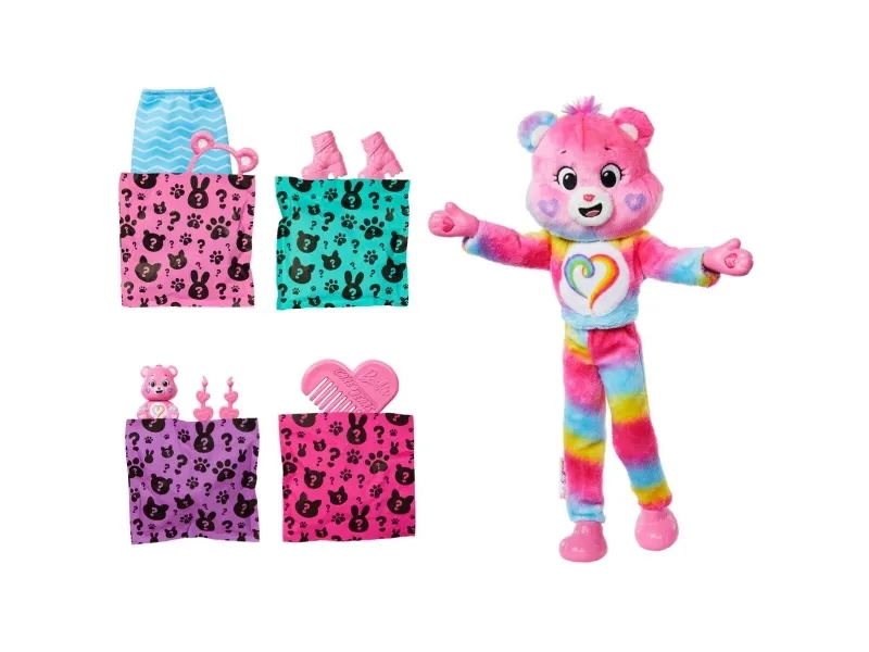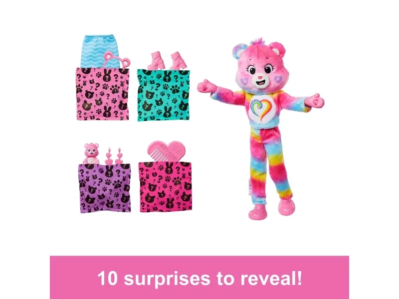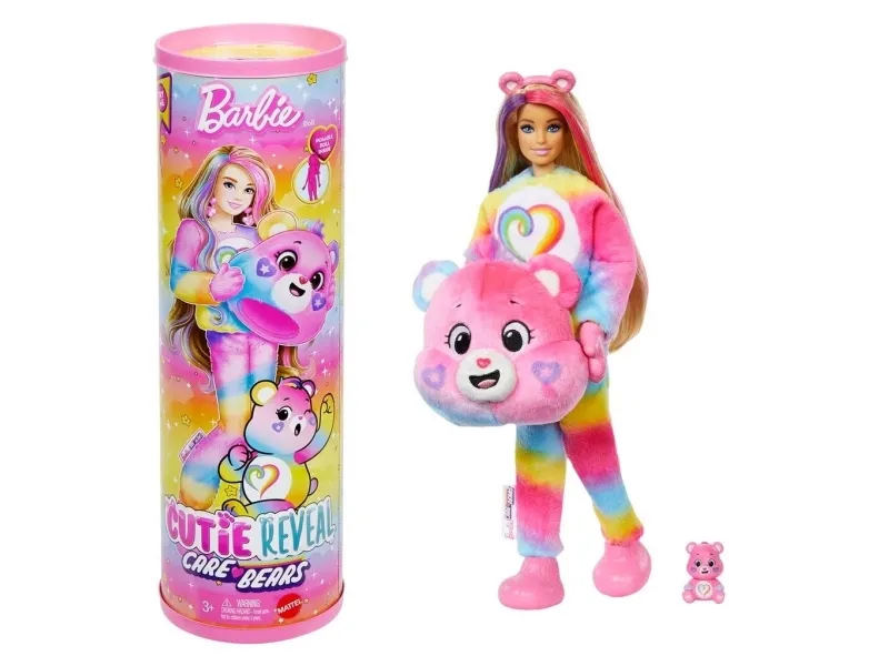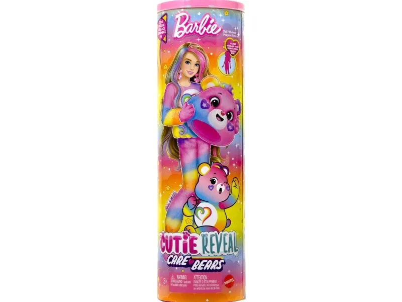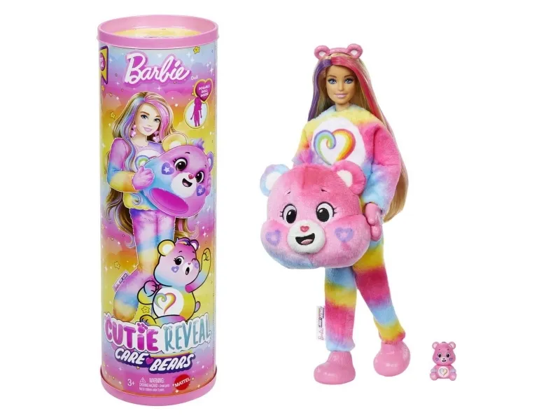Barbie Cutie Reveal Care Bears dolls offer wow moments as kids open the package to find 10 surprises! Discover one of three different Care Bears characters in the line's second series -- Togetherness Bear, Dream Bright Bear or Good Vibes Bear. Remove the adorable plush costume to reveal a posable Barbie doll. Which doll will you reveal? Then find more surprises like a skirt, headband, earrings, a pair of boots or shoes, sponge-comb and matching mini Care Bear! Reverse the plush top for a fleece jacket and flip the costume head for a pet bed. Use water for even more cuteness with repeat colour-change transformation on the doll's face! Kids will love discovering -- and collecting -- all the cute surprises in this lovable series. Each doll sold separately, subject to availability. Dolls cannot stand alone. Colours and decorations may vary.Barbie Cutie Reveal Care Bears Doll & Accessories, Series 2 Togetherness Bear with 10 Surprises. Doll type: Fashion doll, Doll's gender: Female, Recommended age (min): 3 yr(s), Suggested gender: Girl. Height: 303 mm, Weight: 280 g. Material: Fabric, Plastic, Product colour: Multicolour