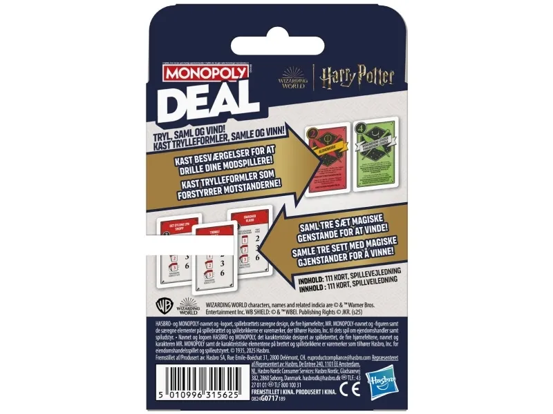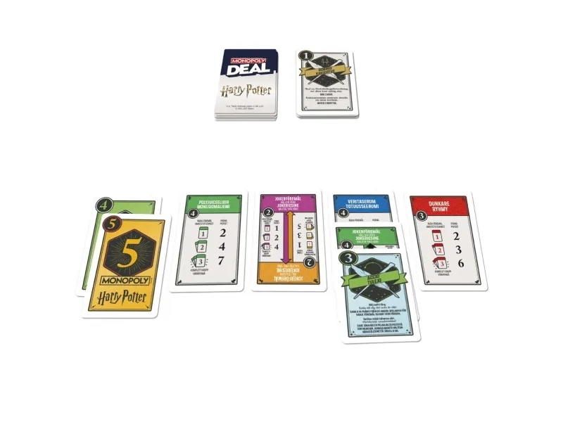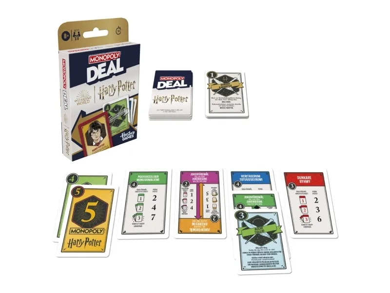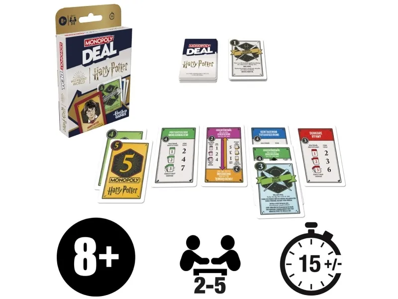 Conjure, collect, and win! In the Monopoly Deal: HARRY POTTER kids card game, a wealth of enchanted objects is waiting to be found. Be the first witch or wizard to collect 3 different sets of magical items to win. Cast spells over opponents to disrupt their plans—and receive help from iconic heroes and villains while dueling for control over the riches of the WIZARDING WORLD! This fun family card game for kids and adults can be played in about 15 minutes, so it’s an ideal game for fitting in family fun anytime. And HARRY POTTER toys and games are wonderful holiday and birthday gifts for teens, adults, and kids.WIZARDING WORLD characters, names, and all related indicia are copyright and trademark Warner Bros. Entertainment Inc. WB SHIELD: Copyright and trademark WBEI. Publishing Rights Copyright JKR. (s25) The HASBRO and MONOPOLY names and logos, the distinctive design of the gameboard, the four corner squares, the MR. MONOPOLY name and character, as well as each of the distinctive elements of the board and playing pieces are trademarks of Hasbro, Inc. for its property trading game and game equipment.