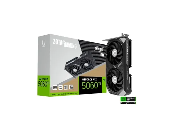 The ZOTAC GAMING GeForce RTX 5060 Ti 16 GB Twin Edge graphics card offers performance for gamers and creators. Featuring an NVIDIA GeForce RTX 5060 Ti graphics processor, this card is designed to handle demanding applications. With 16 GB of GDDR7 SDRAM and a memory speed of 28 Gbps on a 128-bit bus, it ensures smooth gameplay and high-resolution graphics across multiple monitors, supporting up to 4 displays with a maximum external resolution of 7680 x 4320 and a V-Sync rate of 120 Hz. Thanks to its efficient power consumption of 180 watts, users can enjoy strong performance without worrying about energy demands.