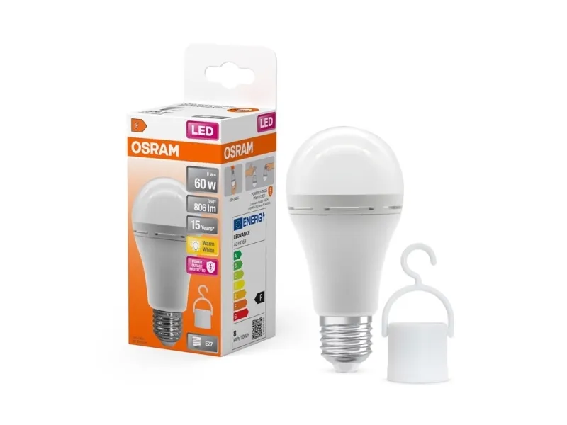 Product type- LED bulbs. Article- 4099854190087. Brand- Osram. Lamp type- LED. Length- 122 - 122mm. Width- 60 - 60mm. Height- 60 - 60mm. Voltage- 220 - 240V. Socket- E27. Luminous flux- 806 - 806lm. Lamp shape- Standard. Colour of light- Warm white. Colour temperature- 2700 - 2700°K. Type of glass/cover- Frosted. Dimmable- No. Lamp designation- A60. Beam angle- 180 °. Lamp efficacy- 100 lm/W. Energy Efficiency Class- F. Average nominal lifespan- 15000 h. Additional information- Standard LED lamp with an integrated rechargeable battery. The Integrated battery can be charged automatically when it is in use via AC Mains. In case of a power outage, the lamp can work as an emergency light.. Mandatory warranty- 24 mo. Warranty for legal entities- 12 mo.
