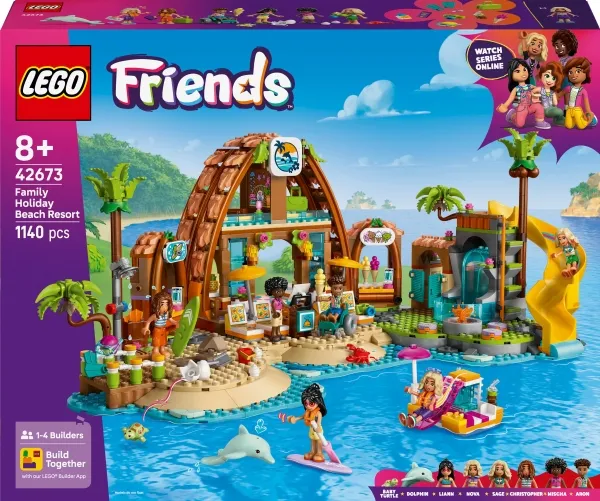 Lähde nauttimaan hauskasta perhelomasta tällä toiminnantäyteisellä 8-vuotiaille ja sitä vanhemmille tytöille ja pojille tarkoitetulla rakennussetillä. LEGO® Friends Koko perheen lomakohde meren rannalla (42673) on täynnä tarinoita, ja se sisältää 6 LEGO Friends mininukkea, delfiini- ja kilpikonnahahmot sekä tarvikkeita luoviin leikkeihin. Rakenna lomakeskus ja keksi sitten jännittäviä seikkailuja ranta-aktiviteettien ja vesiurheilulajien parissa. Etsi kolikko metallinpaljastimella ja peitä sitten joku hahmoista hiekalla. Hupaisaa! Vuokraamosta löydät räpylöitä, snorkkeleita ja surffilautoja. Etsi kilpikonnan salainen luola, kokeile sitten liukumäkeä tai käy jäätelökioskilla ennen kuin asetut rentoutumaan nuotiopaikalle. Tarina jatkuu rakennuksen sisällä, jossa on makuuhuone ja kylpyhuone. Tutustu myös muihin LEGO Friends maailman luoviin leluihin (myydään erikseen). Rakenna yhdessä ystävien ja perheen kanssa LEGO Builder sovelluksella, jolla setin rakentaminen on hauska, yhdessä toteutettava elämys.