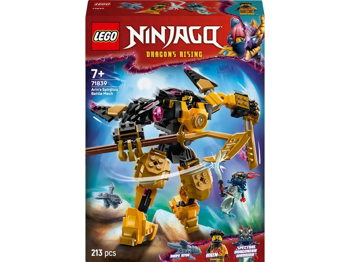 LEGO® NINJAGO Arinin spinjitzu-taistelurobotti (71839) innostaa yli 7-vuotiaat ninjafanit NINJAGO® Lohikäärmeiden nousu ‑TV-sarjan 3. kaudelta tuttuihin seikkailuihin. Setistä rakentuu NINJAGO-robotti, jonka kädet ja jalat voi asettaa ja taivuttaa eri asentoihin. Robotissa on kierrettävä ylävartalo, rintakehässä avattava ohjaamo minihahmoa varten ja tarvikkeena 2 isoa miekkaa.