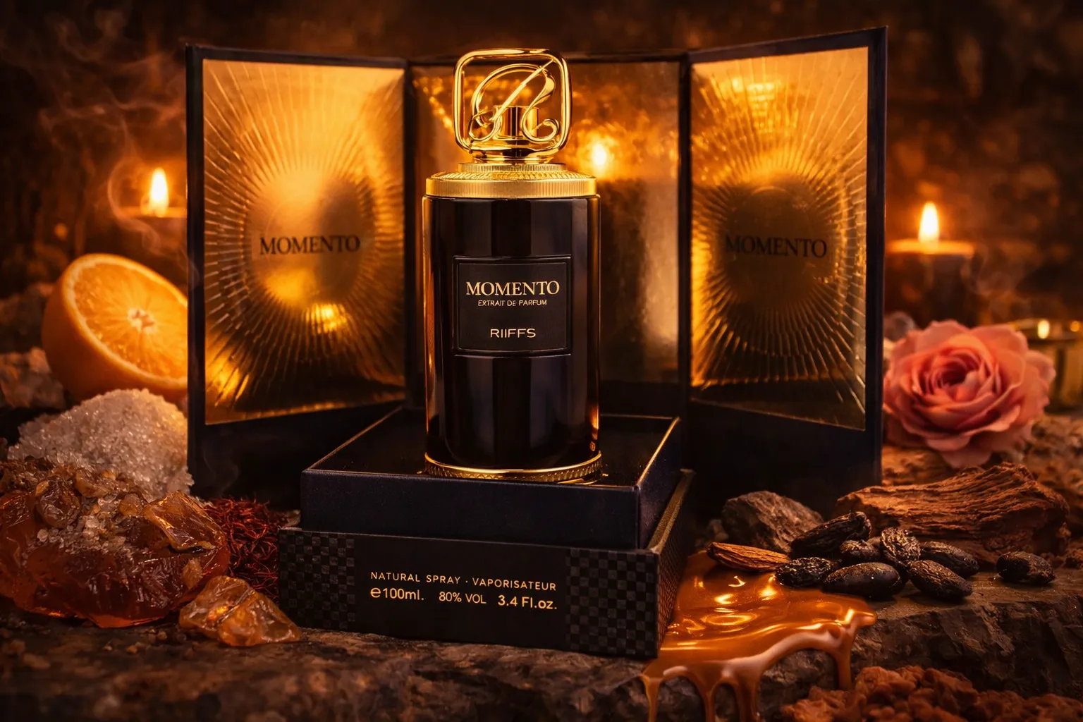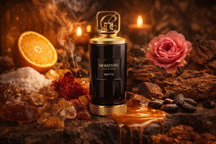 | Riiffs Momento on voimakas ja maskuliininen tuoksu, jossa on lämpimiä, mausteisia ja puumaisia vivahteita. Itsevarma miesten tuoksu, joka on pitkäkestoinen ja luonteikas. Tuoksun nuotit: Päällimmäiset nuotit: sahrami, mandariini, sokeri Sydännuotit: tonkapapu, damaskonruusu, oud Pohjanuotit: setripuu, ambra, karamelli |