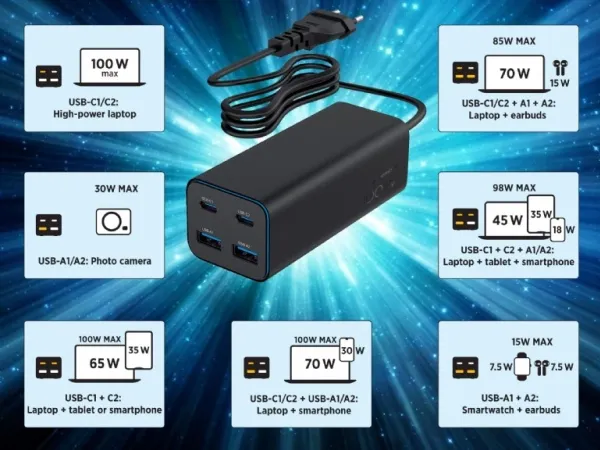 USB-C1/2 - 100 W - 5/9/12/15/20 V - 3/3/3/3/5 A USB-A1/2 - 30 W - 5/9/12 V - 3/3/2.5 A USB-C1 + USB-C2 - 65 W + 35 W USB-C1/2 + USB-A1/2 - 30 W + 70 W USB-A1 + USB-A2 - 7.5 W + 7.5 W USB-C1 + USB-C2 + USB-A1/2 - 45 W + 35 W + 18 W USB-C1/2 + USB-A1 + USB-A2 - 70 W + 15 W USB-C1 + USB-C2 + USB-A1 + USB-A2 - 45 W + 35 W + 15 W
