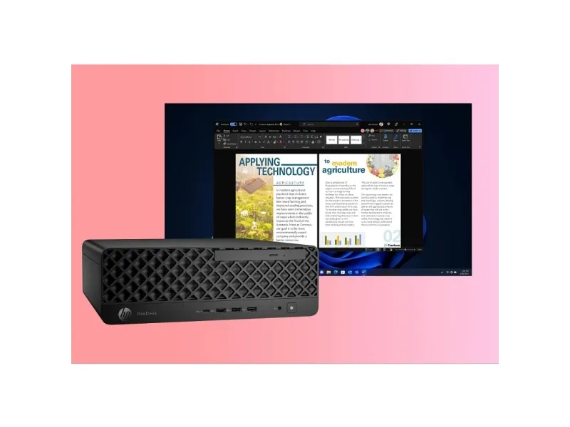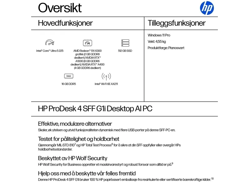 HP ProDesk 4 G1i AI on suunniteltu kompaktiksi ja tehokkaaksi ratkaisuksi henkilökohtaisiin tietokonetarpeisiin. Sen erittäin pienikokoinen muotoilu sopii saumattomasti mihin tahansa työympäristöön. Se toimii tehokkaasti 10–35 °C:n lämpötila-alueella ja takaa luotettavan suorituskyvyn. ENERGY STAR -sertifioitu ja EPEAT-yhteensopiva tietokone on ympäristöystävällinen valinta, joka vähentää energiankulutusta ja tarjoaa samalla tehokkaat toiminnot. Tämä malli on varustettu yhdellä NVM Express SSD -asemalla nopeaa tallennusta varten ja tukee erilaisia liitäntämahdollisuuksia, kuten HDMI, USB 3.2 ja Bluetooth 5.3. Intel Core Ultra 5 -prosessori ja DDR5-RAM-muisti takaavat nopean prosessointinopeuden ja moniajo-ominaisuudet. Lisäksi se sisältää edistyneen äänilähdön Realtek ALC3252:lla ja vankan turvajärjestelmän, joka sisältää sisäänvedettävän riippulukon silmukan parannettua suojausta varten.