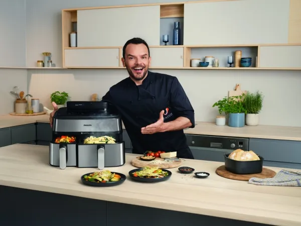 Cook different ingredients in 3 ways at once Now, you can cook, different ingredients, in different ways, without the hassle of coordinating multiple pots and pans. You can choose the cooking method that suit the best your ingredients: Fry, Steam, or a combination of the two.Philips 5000 series NA555/00. Product type: Hot air fryer, Capacity: 9 L, Fryer food capacity: 1.4 kg. Construction type: Double, Product colour: Silver, Control type: Touch. Display type: LED. Power: 2750 W, AC input voltage: 220-240 V, AC input frequency: 50 Hz. Width: 382 mm, Depth: 351 mm, Height: 443 mm