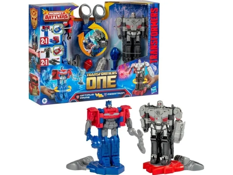 Experience the epic origins of legendary Transformers robots with this Transformers One Battling Robots action figure 2-pack that includes the Optimus Prime figure and the Megatron action figure. Place the action figures on the Battle Base and slide the finger slots for cool action moves. Knock a figure off the base to win! The 4.5-inch (11.5 cm) articulated Optimus Prime figure converts between robot toy and semi-truck toy in 3 steps. The 4.5-inch (11.5 cm) articulated Megatron figure converts between robot toy and tank toy in 5 steps. Includes 2 Battle Bases and accessories that attach in robot mode. This Robot Battlers action figure 2-pack is inspired by an iconic character from the Transformers movie, Transformers One. Movie-inspired Interactive toys make cool gifts for boys and girls ages 6 and up. Transformers One is the untold origin story of Optimus Prime and Megatron, once friends bonded like brothers, who changed the fate of Cybertron forever. Transformers One Robot Battlers 2-Pack. Recommended age (min): 6 yr(s), Number of transformations: 2, Material: Plastic, Product colour: Multicolour. Weight: 165 g