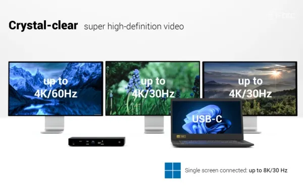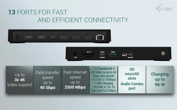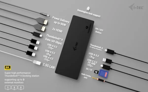 I-Tec TB4TRIPLEDOCKPD -telakointiasema tarjoaa laajat liitännät ja suorituskyvyn saumattomaan käyttökokemukseen. Se tukee jopa kolmea näyttöä ja korkeaa resoluutiota, mikä mahdollistaa moninäyttöiset kokoonpanot, jotka parantavat tuottavuutta ja moniajoa. Yksinkertaista liitäntöjä HDMI-, USB 3.2- ja Ethernet-liitännöillä, jotka tekevät siitä lisävarusteen mihin tahansa työympäristöön. Telakointiasemassa on vankka 160 watin virtalähde, joka varmistaa laitteiden latautumisen, kun dataa siirretään jopa 40 Gbps:n nopeudella. Nauti mukavuudesta ja toiminnallisuudesta tällä monipuolisella telakointiratkaisulla, joka pitää kaiken saatavilla ja järjestyksessä.