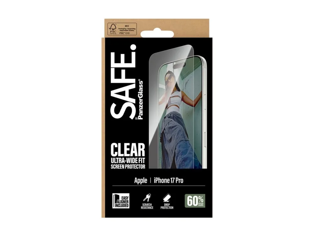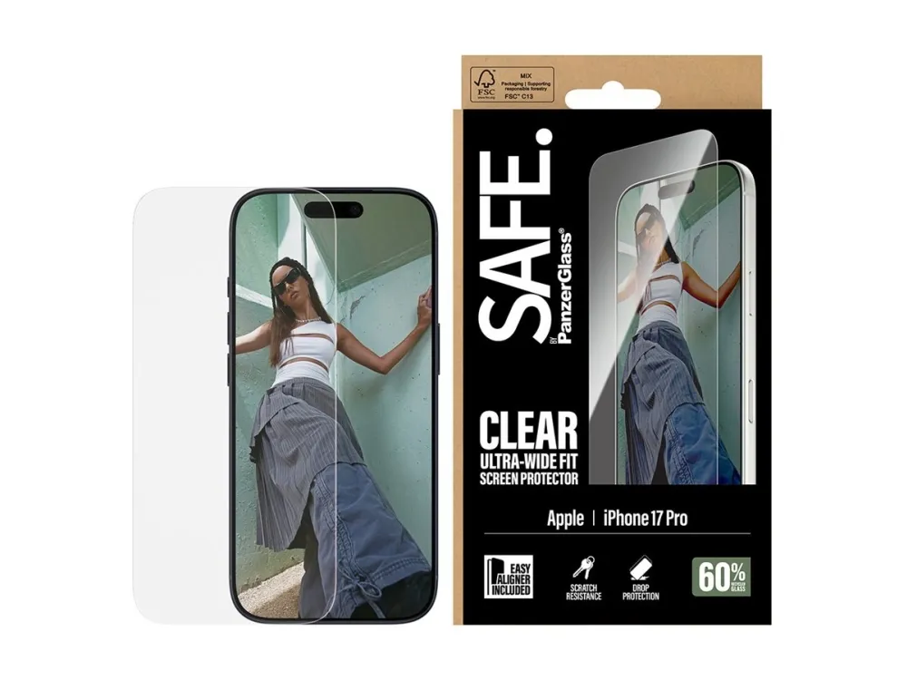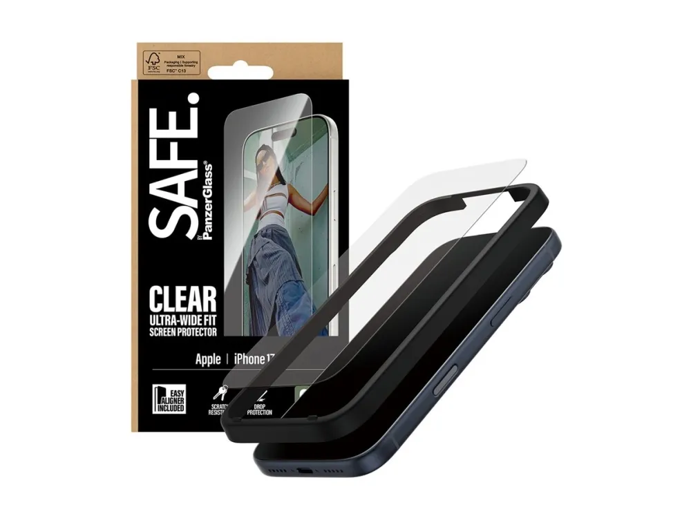 SAFE. is for real. SAFE. is for you. SAFE. is for dance floor mishaps, selfies gone wrong and your everyday fumbling, dropping and screen cracking. This SAFE. by PanzerGlass screen protector made of 60% recycled material acts as a discrete airbag, protecting your phone by absorbing impacts and providing high-level scratch resistance without compromising the functionality and look of your device. It even has a smudge-free coating that reduces traces of fingerprints and grease.Can you feel it? Love is in the air. Love for phones and the planet. It's the new circle of phone life. When you keep your beloved phone SAFE., you can one day pass it on to another phone lover who will love it just as much as you do. Choose SAFE. and give your phone a second, third or fourth life! This is one way of working toward a more sustainable future! Another is to use less and less and LESS packaging: For this screen protector, we've reduced the paper packaging by 33%*. So, of course, this product comes in a recyclable FSC-certified box.Everybody deserves to be SAFE. Without hassle, red tape, or unnecessary complexity. This screen protector comes with an EasyAligner that makes installation a piece of cake (seriously!) and to make it even easier, we've included step-by-step instructions as well as a QR code for quick access to our online how-to video. And remember: You just need to install the screen protection once! Then you'll never again fear the sight of your phone tumbling to the ground screen first. This may not happen, but if it does, you'll regret not having clicked "add to cart".No screen protection is worth poor screen performance! That's why this screen protector comes in Ultra-Wide Fit, meaning it covers the front surface of your phone, providing a complete and crystal-clear view of your screen. It even leaves a little room around the edges to give you the freedom to upgrade your protection with a SAFE. by PanzerGlassTM case. And if you want 360-degree protection, combine the screen protector and case with a SAFE. by PanzerGlass camera lens protector.Keep your phone SAFE.*Measured by third-party lab by comparing the mass of the new paper packaging introduced in 2023 with the mass of the previous paper packaging introduced in 2022 (CPRTC, report No. ZSA20231301-0016).