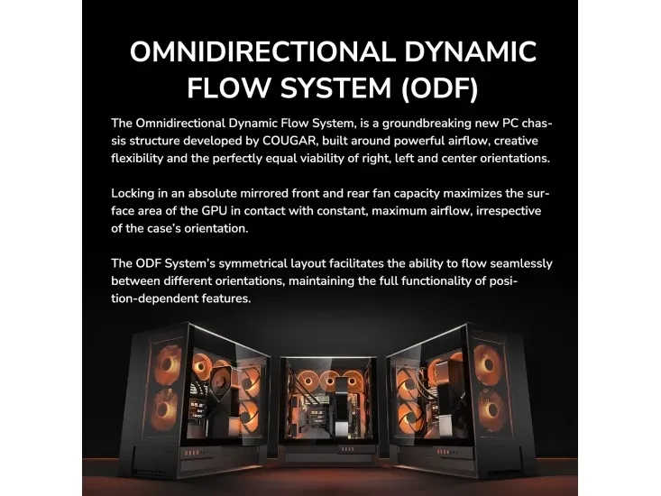 The Omnidirectional Dynamic Flow System, is a groundbreaking new PC chassis structure developed by COUGAR, built around powerful airflow, creative flexibility and the perfectly equal viability of right, left and center orientations.