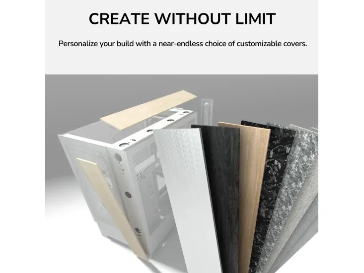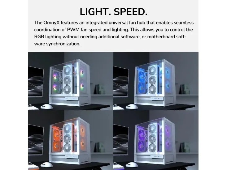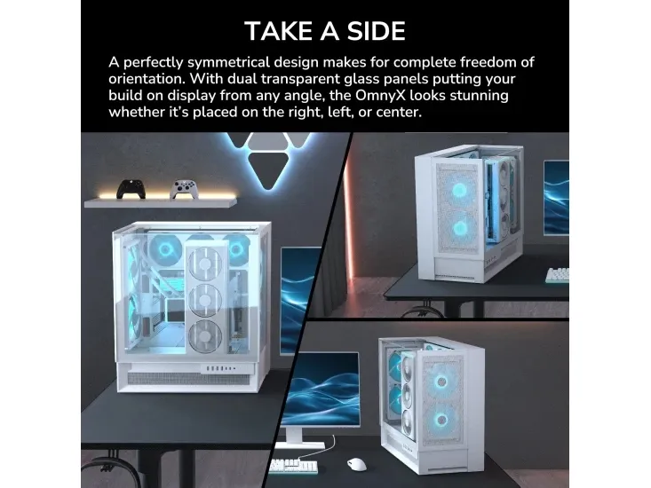 A perfectly symmetrical design makes for complete freedom of orientation. With dual transparent glass panels putting your build on display from any angle, the OmnyX looks stunning whether it’s placed on the right, left, or center.