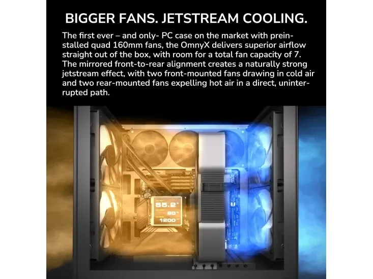 The first ever – and only- PC case on the market with preinstalled quad 160mm PWM fans, the OmnyX delivers superior airflow straight out of the box, with room for a total fan capacity of 7. The mirrored front-to-rear alignment creates a naturally strong jetstream effect, with two front-mounted fans drawing in cold air and two rear-mounted fans expelling hot air in a direct, uninterrupted path. An equal distribution of reverse and forward blade fans allow for flexible intake modes, creating a smooth, directionally consistent airflow no matter how you choose to orient your build.