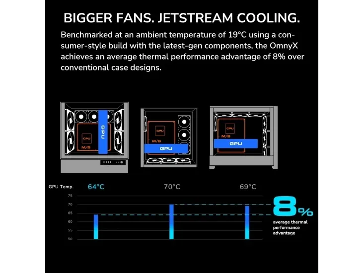 Locking in an absolute mirrored front and rear fan capacity maximizes the surface area of the GPU in contact with constant, maximum airflow, irrespective of the case’s orientation.