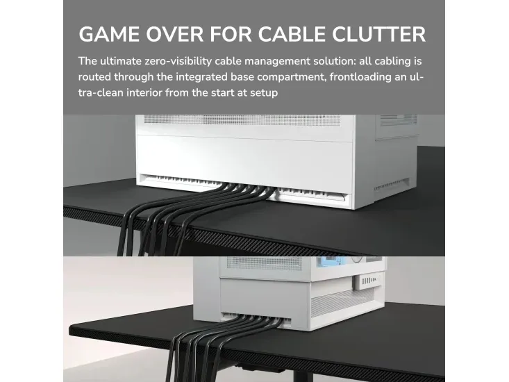 The ultimate zero-visibility cable management solution: all cabling is routed through the integrated base compartment, frontloading an ultra-clean interior from the start at setup.