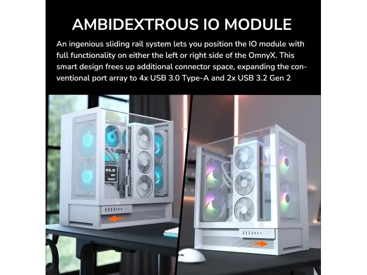 An ingenious sliding rail system lets you position the IO module with full functionality on either the left or right side of the OmnyX. This smart design frees up additional connector space, expanding the conventional port array to 4x USB 3.0 Type-A and 2x USB 3.2 Gen 2 Type-C.