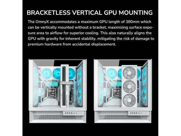 The OmnyX accommodates a maximum GPU length of 380mm which can be vertically mounted without a bracket, maximizing surface exposure area to airflow for superior cooling. This also naturally aligns the GPU with gravity for inherent stability, mitigating the risk of damage to premium hardware from accidental displacement.