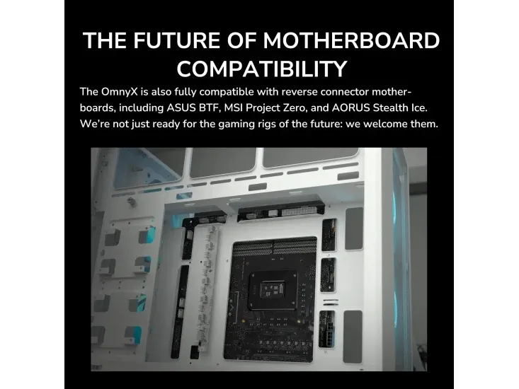 The OmnyX is also fully compatible with reverse connector motherboards, including ASUS BTF, MSI Project Zero, and GIGABYTE Project Stealth. We’re not just ready for the gaming rigs of the future: we welcome them.
