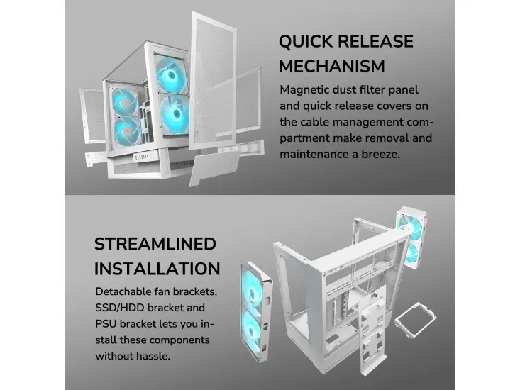 Magnetic dust filter panel and quick release covers on the cable management compartment make removal and maintenance a breeze.