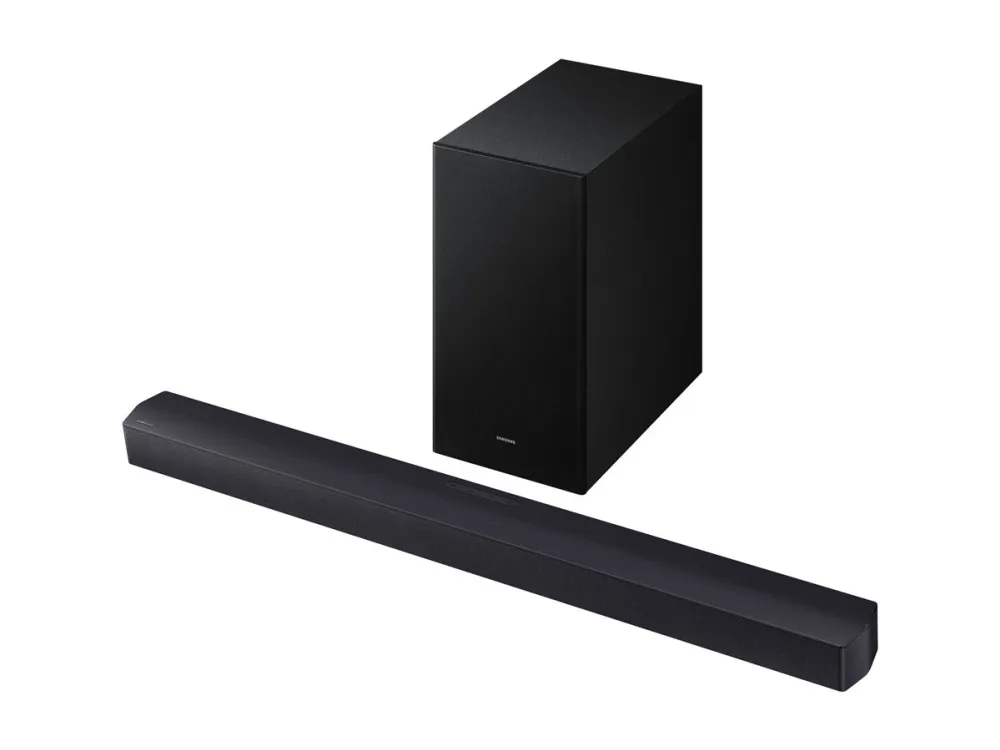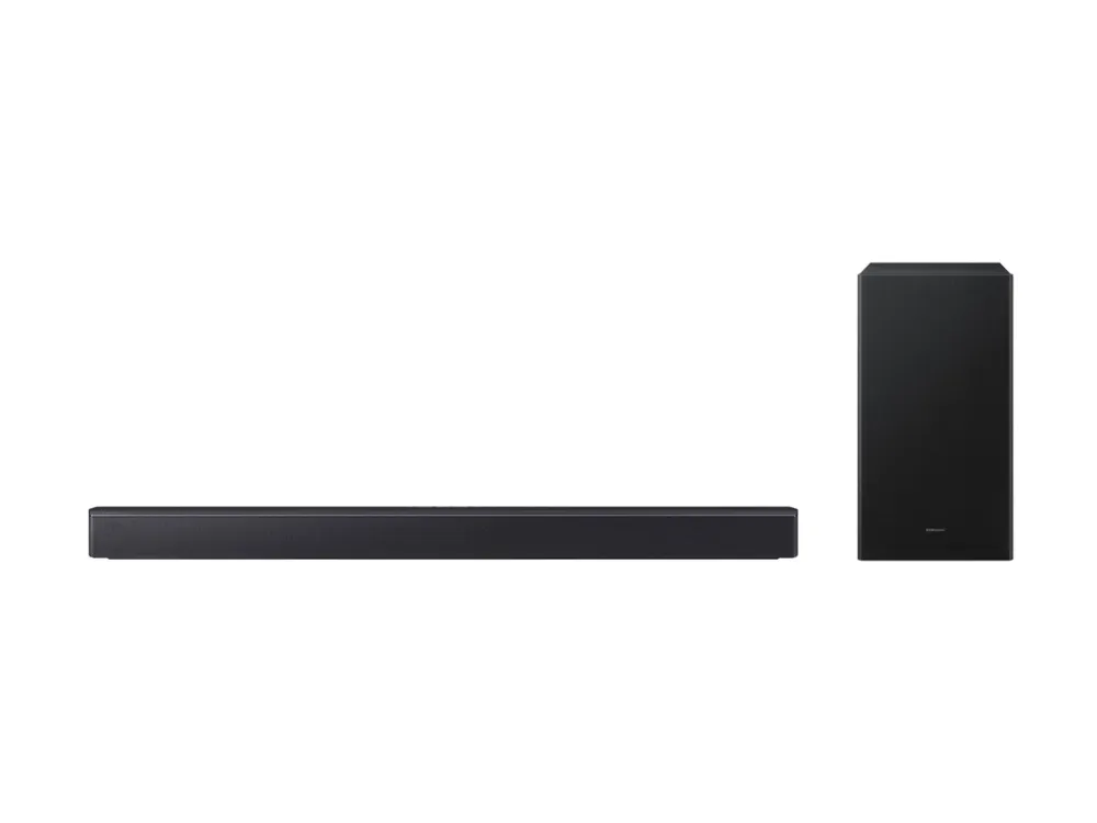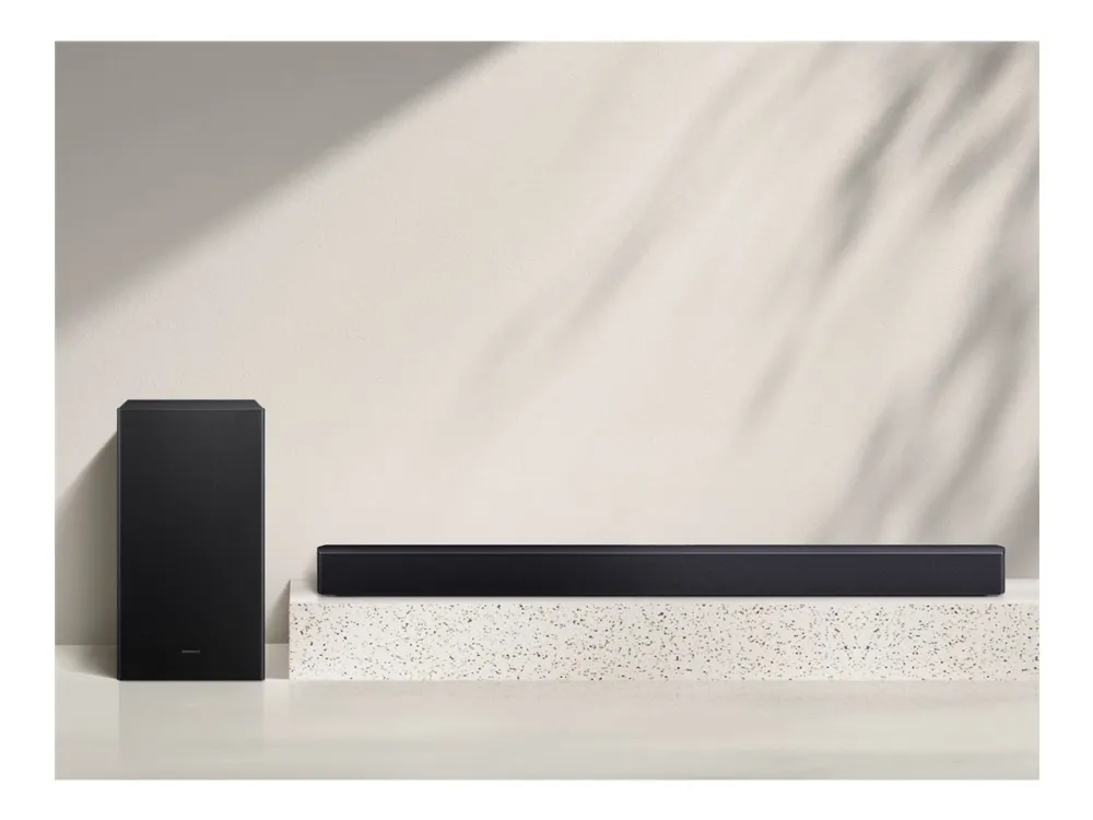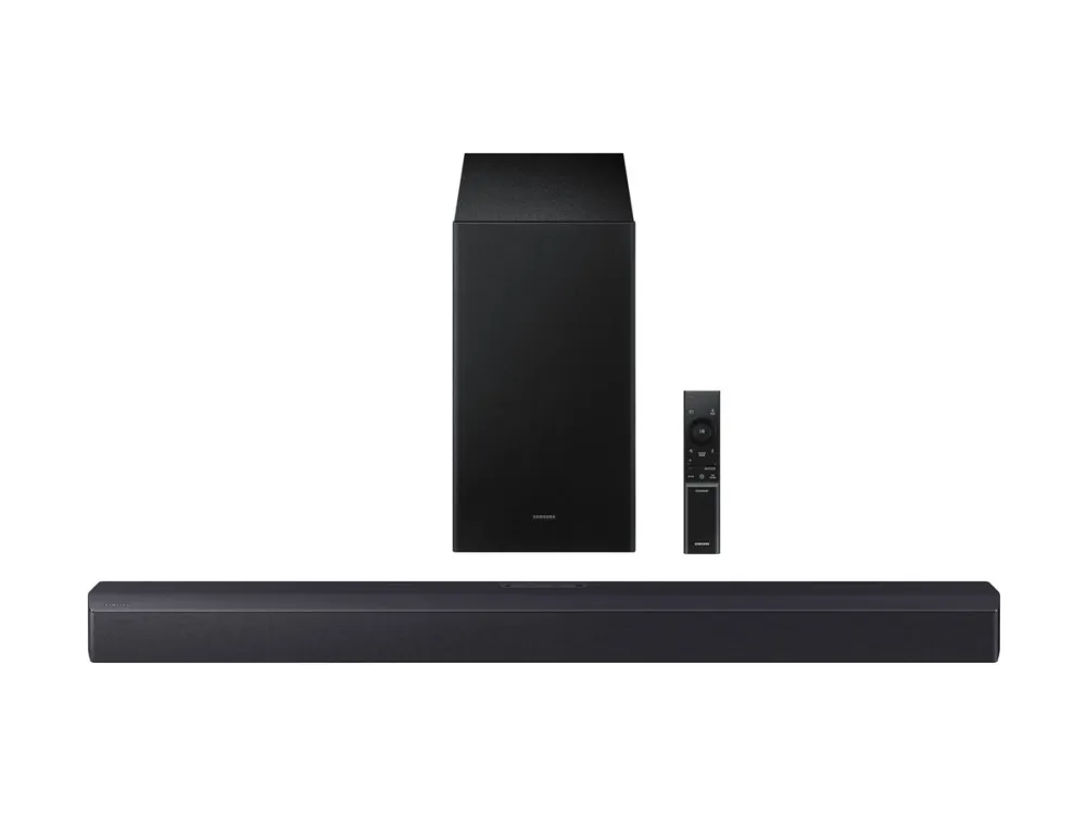 The Samsung HW-B450F is designed to elevate the auditory experience. This sound bar system supports a variety of audio formats, including WAV, AAC, MP3, FLAC, and 2-channel LPCM, ensuring versatile playback options. With built-in Dolby Audio decoders, it delivers impressive surround sound and clarity, enhanced by features like Night Mode and Voice Enhancement. The sleek design allows for easy integration into your home entertainment system, transforming the way you enjoy movies, music, and games. Connectivity is streamlined with options such as Bluetooth 4.2, HDMI-eARC, and USB-host. This allows for wireless or wired audio streaming, accommodating various devices for maximum compatibility. Whether hosting a movie night or listening to your favorite playlist, the HW-B450F provides dynamic audio and rich sound effects, creating an immersive audio experience.