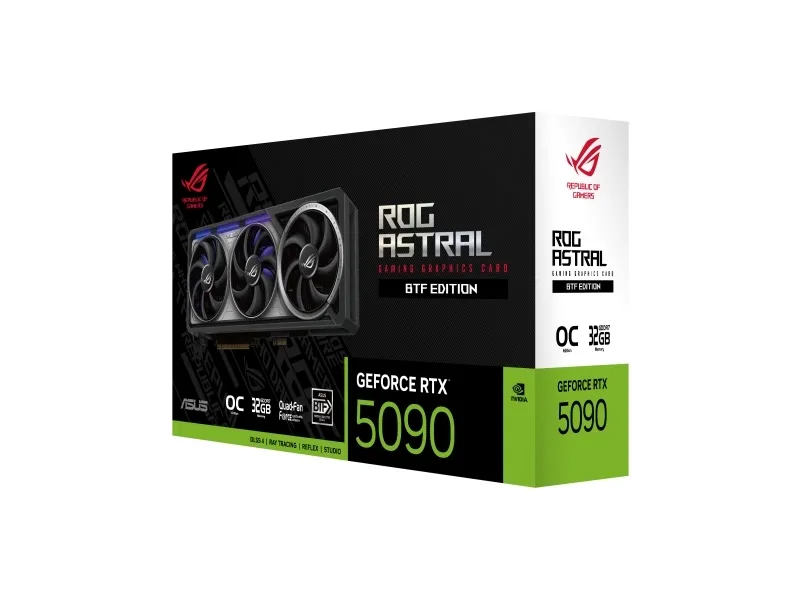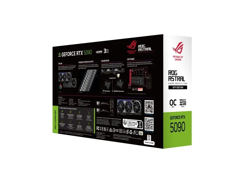 The ASUS ROG Astral combines high performance and innovative technology for an exceptional gaming experience. Featuring the NVIDIA GeForce RTX 5090 graphics processor, this graphics card delivers visuals with a maximum external resolution of 7680 x 4320. With an installed size of 32 GB GDDR7 SDRAM and a memory speed of 28 Gbps, it ensures smooth gameplay and responsiveness across multiple monitors, supporting up to four displays simultaneously. Equipped with advanced features such as VR readiness, NVIDIA G-Sync integration, and dual BIOS, the ASUS ROG Astral is designed for gamers and creators alike. The unique vapor chamber cooling technology, along with the 3.8-slot Fan Cooler and quad fan design, ensures optimal thermal performance for sustained usage during intense tasks. Additionally, the inclusion of ASUS AURA SYNC support, ARGB lighting, and NVIDIA DLSS 4 enhances the visual experience, making this graphics card a choice for those who seek quality in their gaming setup.