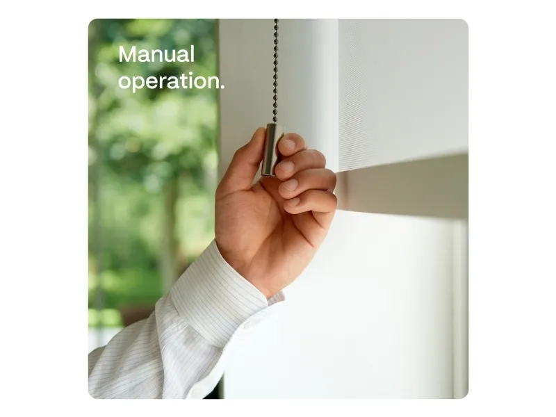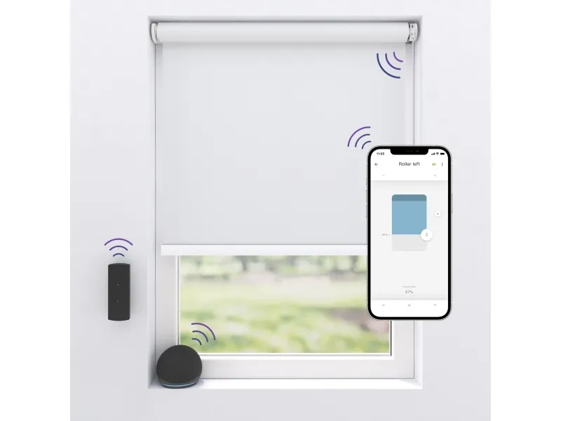 Transform your room with this stylish electric roller blind completely pre-assembled with motor, making it a seamless addition to your home. With just a gentle pull, the blinds will automatically open or close, providing you with added convenience. By adding the Motionblinds Bridge, you gain access to additional features, such as automatic closing based on sunset times, compatibility with popular smart home platforms and voice assistants, and remote operation from anywhere using the Motionblinds Bridge app. The motor featuring a USB-C rechargeable battery is discreetly hidden inside the roller blind, ensuring a clean look without visible wires. Installation is a breeze, as it requires no complicated wiring. Plus, the battery only needs to be charged twice a year which can be done whilst mounted/in operation. The width listed is the width of the roller blind excluding an additional 3 cm when mounted. The roller blind can be shortened to a minimum of 41 cm. For your convenience, the blind comes pre-assembled, making installation easy. INSTALLATION: Installing this smart roller blind is easy and no different then standard roller blinds. Simply mount the end-plug in the roller blind and mount the brackets to your wall or ceiling. Once that’s done, click the blind into the brackets, and you can set-up the motor. If you want to operate your blinds from anywhere or use smart home platforms and voice commands, you can add a Motionblinds Bridge. Smart window coverings are designed to effectively regulate natural daylight and sunlight like no other device can. By doing so, they enhance the key benefits of a smart home, including safety, energy efficiency, and convenience. With smart window coverings, you can enjoy optimal lighting while reducing energy costs and increasing your home's comfort. Electric roller blinds that can be controlled and monitored from anywhere give your home a lived-in appearance, making it look occupied even when you're away. This feature not only improves the security of your property by simulating presence but also offers peace of mind. By using preset timers or connecting your blinds to other smart home devices, you can maintain a comfortable indoor climate all year round. Your blinds will help keep your home cool in the summer by blocking out heat and warm in the winter by retaining heat. With smart blinds, you’ll enjoy added convenience and energy savings while creating a cozy atmosphere in your home! Electric roller blinds move with your daily routine, creating the perfect atmosphere at any time of day. You can easily create privacy at night with just a voice command or set them to work automatically with other smart devices in your home. Enjoy the convenience and comfort of having your blinds adjust to your lifestyle, making your living space more inviting and secure. Operate your electric roller blinds in several ways: A short pull on the chain will set the blinds in motion, Remote control – sold separately, Motionblinds Bridge-app (requires bridge – sold separately), Smart home apps like Samsung SmartThings, Amazon Alexa and Google Home (requires bridge – sold separately). The packaging includes: Electric roller blind (motor pre-assembled), brackets for wall- or ceiling mounting, installation-manual and setup guide. The curtain, mobile phone, Motionblinds remote and Alexa smart speaker are for illustrative purposes only. They are not included.