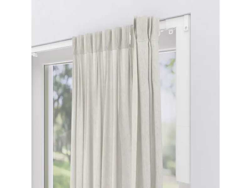 Transform your curtains with this stylish electric curtain rail designed to fit standard pleated curtains (wave-curtains not possible), making it a seamless addition to your home. With just a gentle pull, your curtains will automatically open or close, providing you with added convenience. You can also control the motor from your smartphone at home using the Motionblinds Bluetooth app, where you can set timers for when you want your curtains to open or close. By adding the Motionblinds Bridge, you gain access to additional features, such as automatic closing based on sunset times, compatibility with popular smart home platforms and voice assistants, and remote operation from anywhere using the Motionblinds Bridge app. The motor featuring a USB-C rechargeable battery is discreetly hidden behind the curtain pack, ensuring a clean look without visible wires. Installation is a breeze, as it requires no complicated wiring. Plus, the battery only needs to be charged once a year and can be easily removed from the curtain rail for convenient charging. The packaging includes: Electric curtain rails, connector plates, Motionblinds CM-36-W motor with battery, brackets for wall- and ceiling mounting, runners for pleat-curtains, installation-manual and setup guide, hex- and torx-keys. The curtain, mobile phone, Motionblinds remote and Alexa smartspeaker are for illustrative purposes only. They are not included.