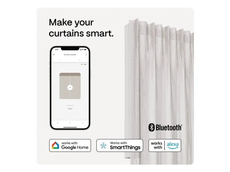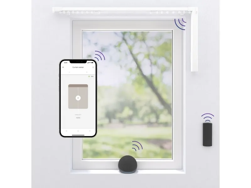 Transform your curtains with this stylish electric curtain rail designed to fit standard pleated curtains (wave-curtains not possible), making it a seamless addition to your home. With just a gentle pull, your curtains will automatically open or close, providing you with added convenience. You can also control the motor from your smartphone at home using the Motionblinds Bluetooth app, where you can set timers for when you want your curtains to open or close. By adding the Motionblinds Bridge, you gain access to additional features, such as automatic closing based on sunset times, compatibility with popular smart home platforms and voice assistants, and remote operation from anywhere using the Motionblinds Bridge app. The motor featuring a USB-C rechargeable battery is discreetly hidden behind the curtain pack, ensuring a clean look without visible wires. Installation is a breeze, as it requires no complicated wiring. Plus, the battery only needs to be charged once a year and can be easily removed from the curtain rail for convenient charging. The packaging includes: Electric curtain rails, connector plates, Motionblinds CM-36-W motor with battery, brackets for wall- and ceiling mounting, runners for pleat-curtains, installation-manual and setup guide, hex- and torx-keys. The curtain, mobile phone, Motionblinds remote and Alexa smartspeaker are for illustrative purposes only. They are not included.