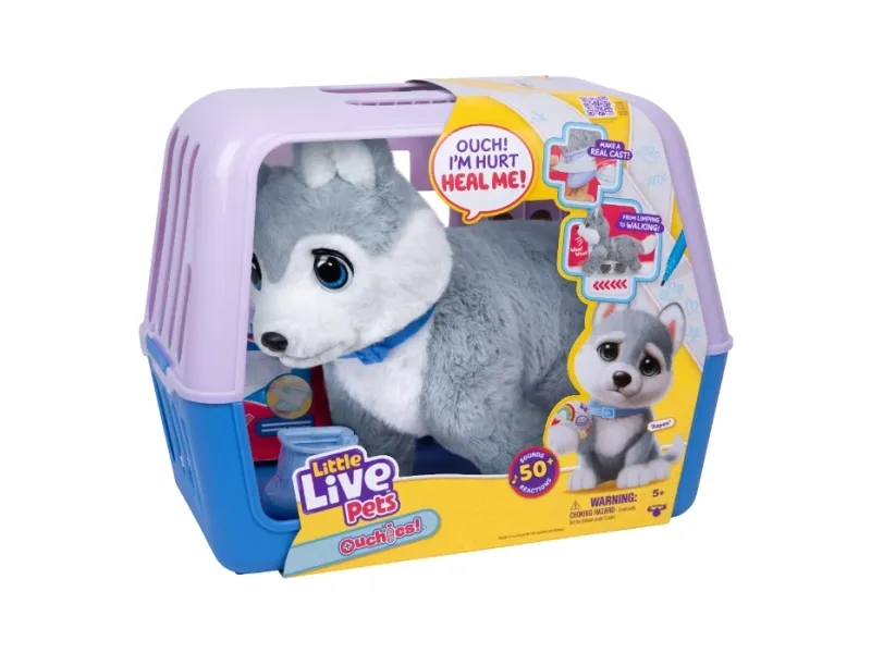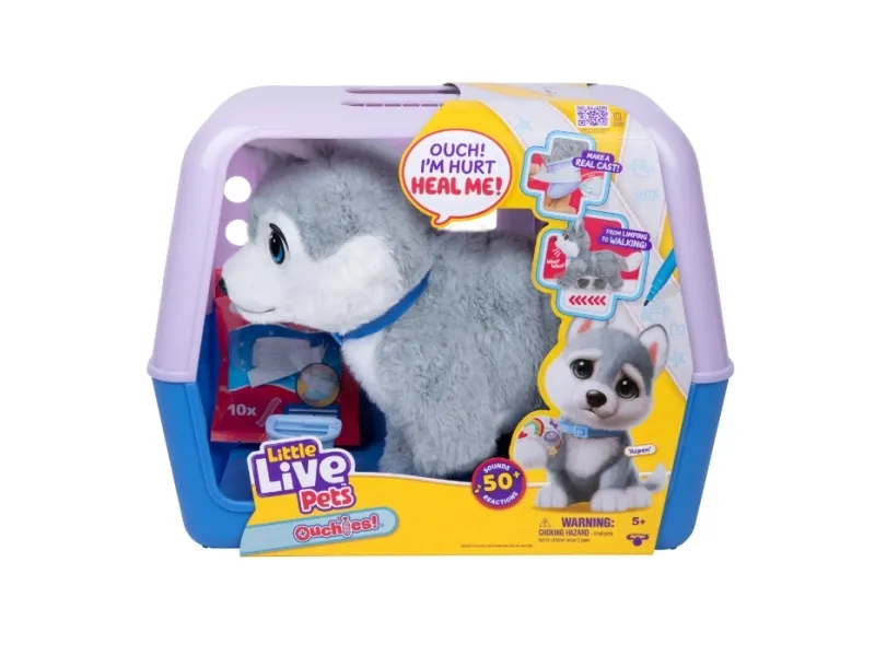 Little Live Pets Ouchies! Aspen is an adorable husky puppy that needs your care to heal her injured leg! With over 50 sounds and reactions, Ouchies is so interactive - she walks, reacts to your touch, has glowing cheeks and more!