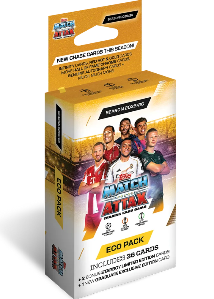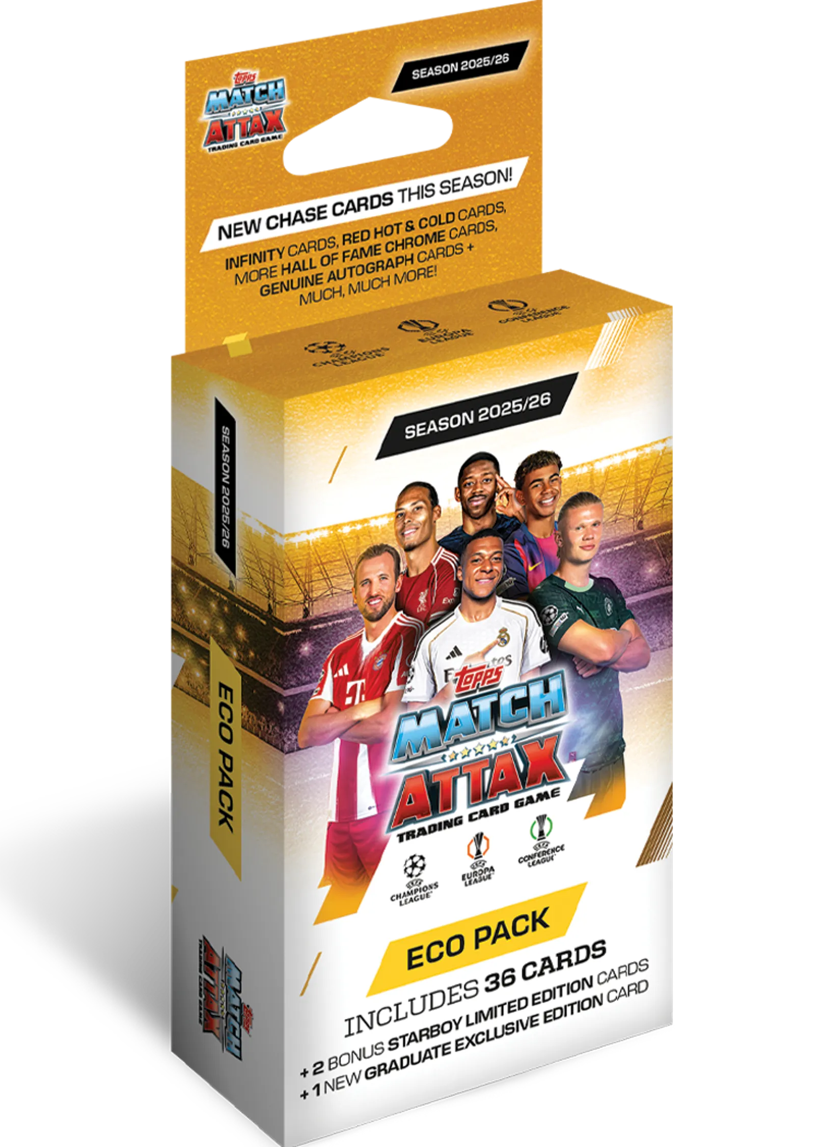 Topps UCC Match Attax -keräilykortit kaudelle 2025/26. Toppsin Match Attax -keräilykorteilla on Euroopan kolmen suurimman jalkapalloseuraturnauksen virallinen lisenssi: Mestarien liigan, Eurooppa-liigan ja konferenssiliigan. Match Attax -kokoelmalla voit saada käsiisi kaikki Euroopan parhaimpien seurajoukkueiden kovimmat jalkapalloilijat: Lamine Yamal (Barcelona), Kylian Mbappé (Real Madrid), Ousmane Dembelé (PSG) ja muita! Kokoelmassa on tunnettu peruskorttisarja, kiiltäviä folioita, erikoisinserttejä, limited edition kortteja sekä uusia että tunnettuja korttityylejä. Oletko tarpeeksi onnekas avataksesi pakkauksen, joka sisältää yhden harvinaisista ja halutuista Match Attax 2025/-26 korteista?