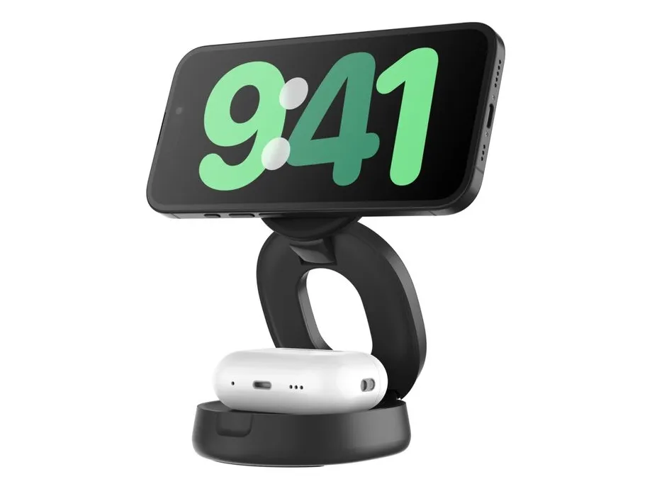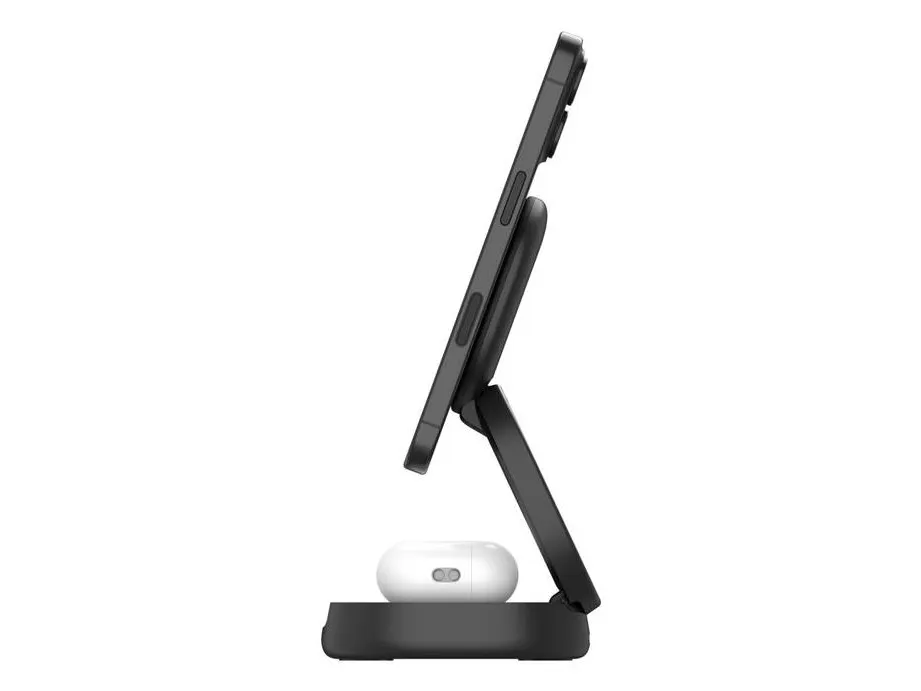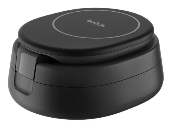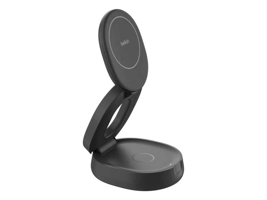 The Belkin BoostCharge 2-in-1 wireless charging stand offers a versatile and efficient way to power your devices. With its compact design and magnetic alignment feature, this charging station securely holds both a cellular phone and a smart watch or wireless earphones, allowing for simultaneous charging. The foldable feature enhances portability, making it easy to carry and use in different settings. Whether placed in portrait or landscape orientation, the wireless charging stand delivers up to 15 W of power, ensuring your devices are charged quickly and effectively. Made from recycled plastic, this charging solution is functional and environmentally conscious, appealing to those looking to reduce their carbon footprint.