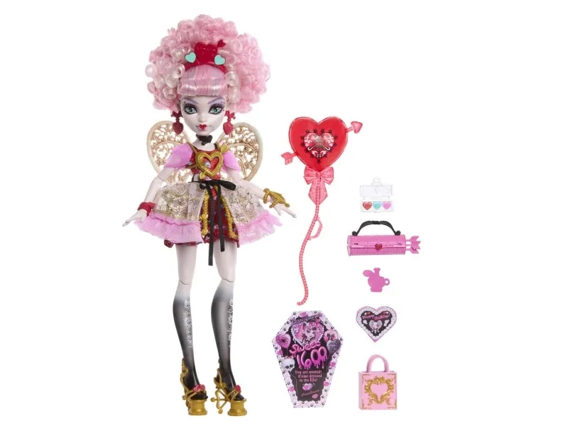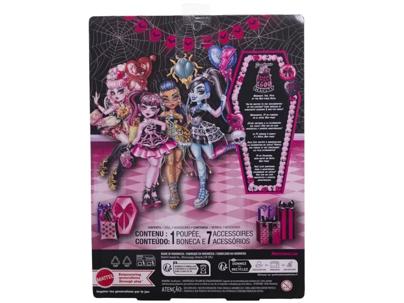 Draculaura is throwing a Scary Sweet Birthday party, which means these Monster High dolls are headed to the skelebration of the century! It's not every day a ghoul turns 1600, so what better than a bewitching birthday bash to mark the occasion? Each Scary Sweet Birthday doll is dressed to the thirteens in a dread-lightful look and comes with balloons, invites, birthday cards, gifts, and more. With so many adorable accessories, there's no doubt that this party will be a frightfully fun time! Each sold separately, subject to availability. Dolls cannot stand alone. Colours and decorations may vary.Monster High Scary Sweet Birthday Frankie Stein Doll in Party Dress with Balloon & Gift. Doll type: Fashion doll, Doll's gender: Female, Recommended age (min): 4 yr(s), Suggested gender: Boy/Girl. Height: 290 mm, Weight: 250 g. Material: Plastic, Product colour: Multicolour