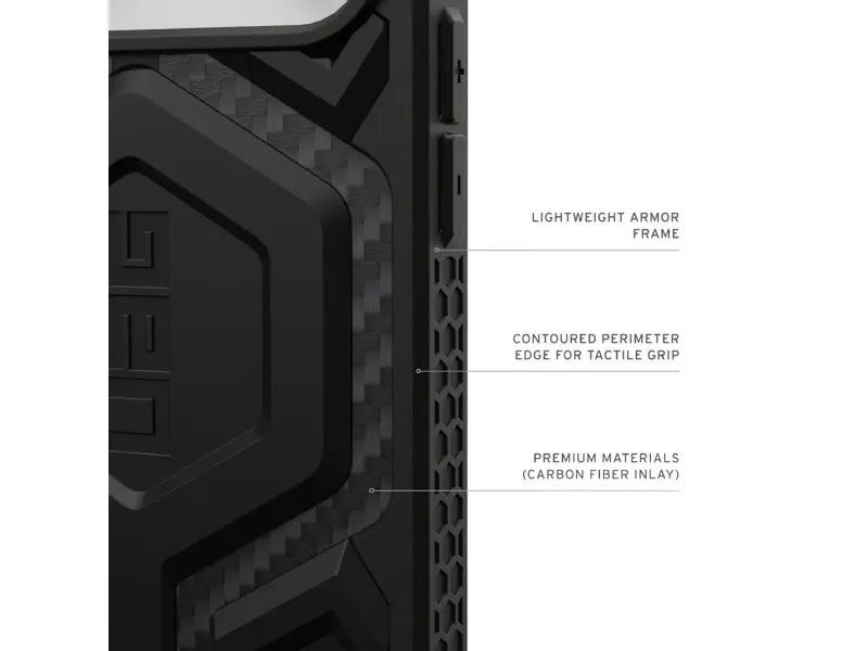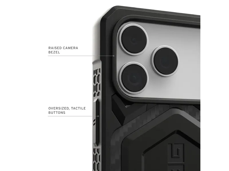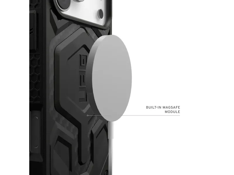 Unleash the ultimate protection for your Apple iPhone 17 Pro Max with the UAG Monarch Pro - Carbon Fiber Case. This rugged all-terrain case combines unrivaled durability with seamless magnetic charging functionality ensuring your device stays protected and charged in any environment. 5-layer protection system Integrated magnetic module Premium carbon fiber finish Drop protection of 7.6 m Tactile grip and responsive buttons 5-layer protection system The UAG Monarch Pro features an innovative 5-layer construction that provides unrivaled protection for your iPhone 17 Pro Max. The case starts with an impact-resistant core that absorbs and disperses shocks from accidental drops. The distinctive armored frame made from sleek carbon fiber adds strength and style. A polycarbonate plate provides rigidity and scratch resistance while an impact-resistant rubber rim adds extra cushioning against bumps and knocks. Integrated magnetic module Stay connected and charged with the built-in magnetic module which is compatible with MagSafe Qi and most wireless chargers and magnetic accessories. This seamless integration ensures perfect alignment for faster wireless charging and supports Samsung Pay so you can use your device's features without compromise. Premium carbon fiber finish The UAG Monarch Pro showcases a sophisticated carbon fiber finish on its armored frame providing both enhanced strength and a distinct modern aesthetic. This premium material not only increases the case's durability but also gives your iPhone 17 Pro Max a sleek professional look. 7.6m drop protection The UAG Monarch Pro has been independently tested to withstand drops up to 7.6 meters and exceeds military drop test standards (MIL STD 810G 516.6) by 5 times. This exceptional level of protection ensures your device remains safe even in the most challenging conditions giving you peace of mind wherever your adventures take you. Tactile grip and responsive buttons Designed for optimal usability the UAG Monarch Pro features a contoured edge with a non-slip grip for safe and easy handling. Ultra-responsive oversized tactile buttons provide a crisp click feel so you never miss a beat when using your device. Plus integrated lanyard anchor points provide extra security and convenience for those who prefer to keep their phone close at hand. Package includes: 1 x UAG Monarch Pro Case for Apple iPhone 17 Pro Max - Carbon Fiber Product Specifications: Compatible with: iPhone 17 Pro Max Drop Protection: Up to 7.6 meters Materials: Shock-resistant core carbon fiber frame polycarbonate plate impact-resistant rubber surround Wireless charging: Compatible with MagSafe Qi and most wireless chargers Military standard: Passes 5X MIL-STD 810G 516.6