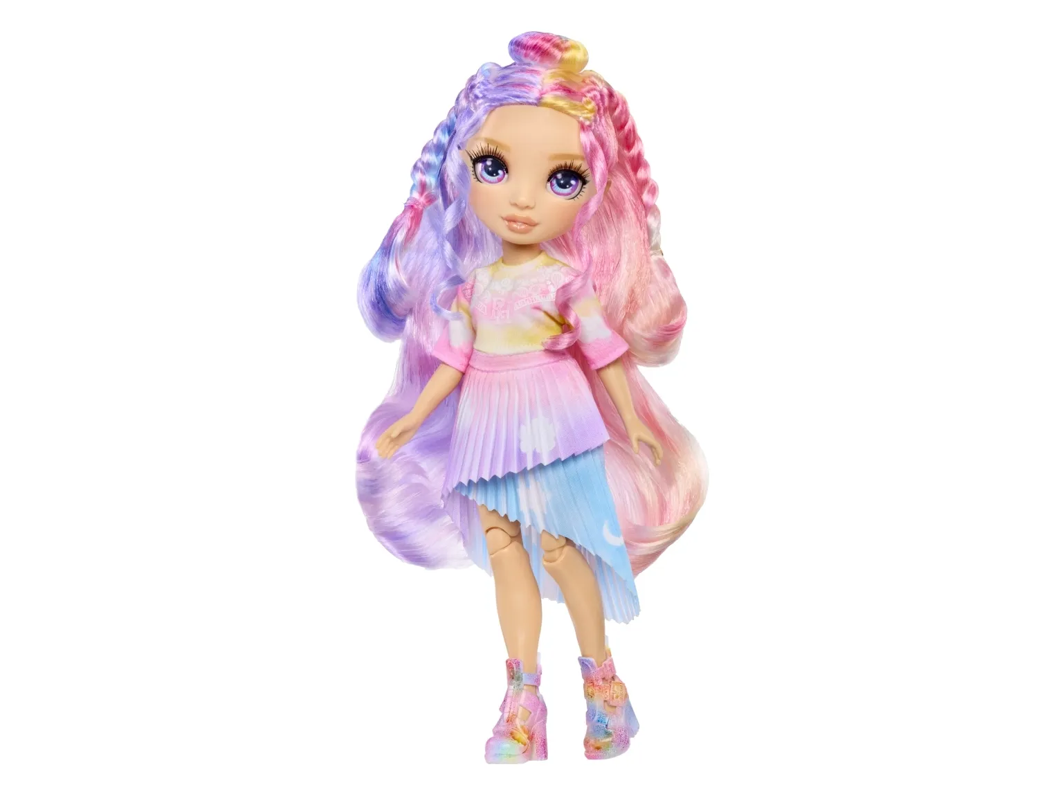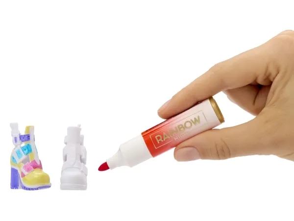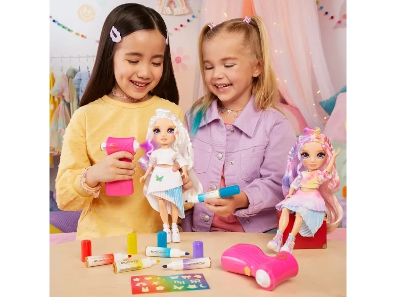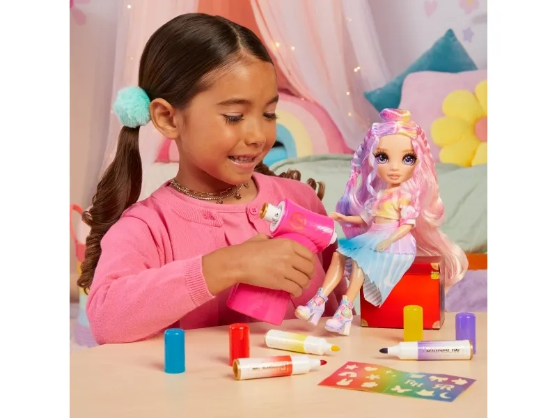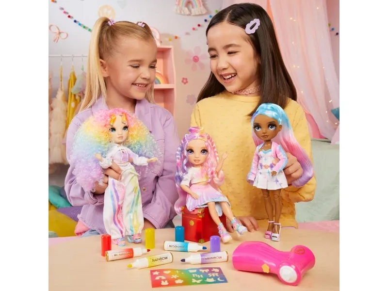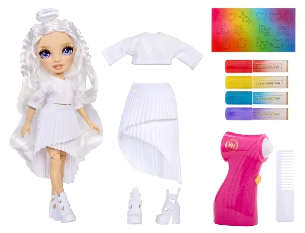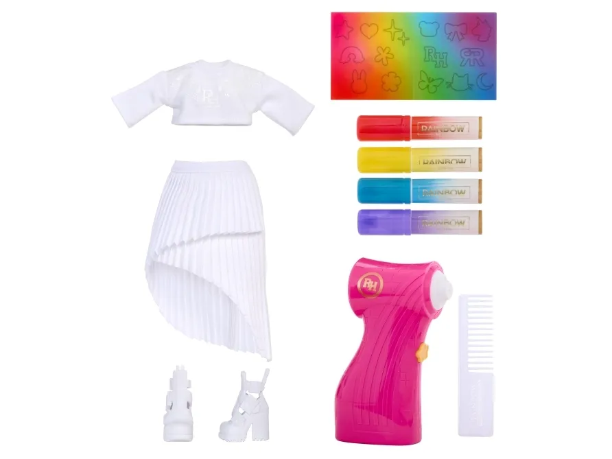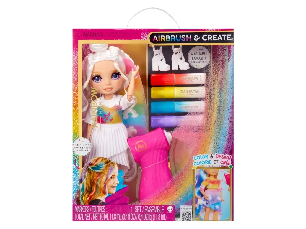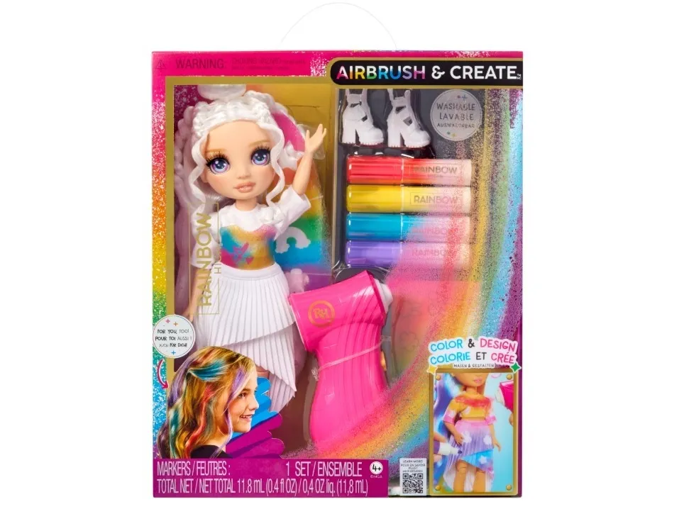 At Rainbow High, their mission is to inspire endless creativity and colorful confidence. Rainbow High is excited to present a fresh way to bring your DIY washable dolls to life — now featuring airbrush techniques and vibrant markers for our iconic Color & Create fashion dolls. Each doll comes dressed in all-white, from head to toe, making it easier than ever to add your own colors and create stunning designs again and again. With long, brushable white hair ready for styling, and six vibrant markers included, the possibilities are endless. Plus, an extra white t-shirt is included for even more coloring fun, so you can create over and over! Requires 4 x AAA batteries (not included). From 4 years. Includes: - Rainbow High Air Brush & Create fashion doll 28 cm with long, white, brushable hair, all dressed in white - all dressed in white - airbrush tool - 6 vibrant markers - extra t-shirt