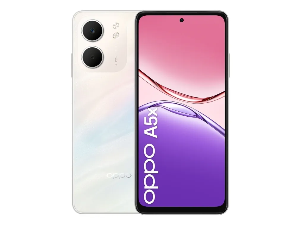 OPPO A5x . Display diagonal: 16.9 cm (6.67"), Display resolution: 1604 x 720 pixels. Processor frequency: 2.1 GHz, Processor family: Qualcomm Snapdragon, Processor model: 6s Gen 1. RAM capacity: 4 GB, RAM type: LPDDR4X, Internal storage capacity: 128 GB. Rear camera resolution (numeric): 32 MP, Rear camera type: Single camera. SIM card capability: Dual SIM. Operating system installed: Android 15. Battery capacity: 6000 mAh. Product colour: White. Weight: 193 g