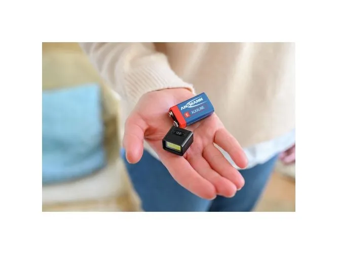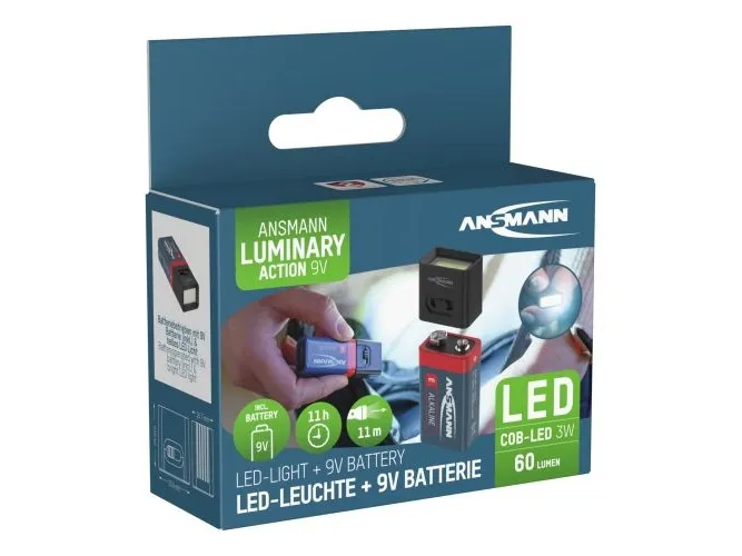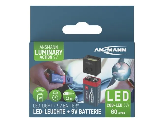 Daylight The 9 V lamp not only impresses with its simple operation and high efficiency, but also with its outstanding light quality. With a colour temperature of 6500 K, it provides a cool, daylight-like light that is pleasant for the eyes. In addition, the lamp has a colour rendering index (CRI) of 70, which means that colours are reproduced faithfully and vividly.Ansmann 1600-0714. Flashlight type: Hand flashlight, Product colour: Black, Housing material: ABS synthetics. International Protection (IP) code: IP20, Operating temperature (T-T): 10 - 35 °C. Lamp type: COB LED, Lamps quantity: 1 lamp(s), Lamp power: 3 W. Battery type: 9V, Battery life (max): 12 h. Width: 25.6 mm, Depth: 16.7 mm, Height: 24 mm