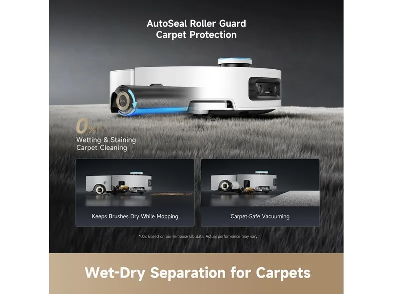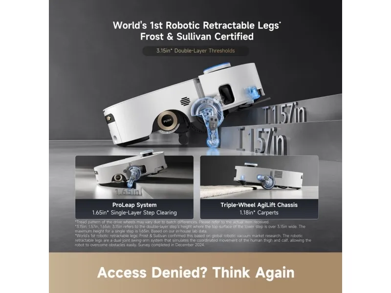 FlexRise™ Air Suspension: The Off-Road Mastery for Your Home While others still flinch when facing obstacles, the ProLeap™ system intelligently lifts its retractable legs to effortlessly climb obstacles up to 3.15in—the highest in its class.
