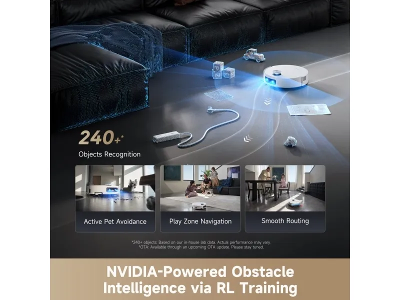 Upgraded AstroVision™: NVIDIA-Powered Obstacle Intelligence via RL Training Pets wander, toys scatter, furniture shifts—the vacuum sees it all. 2 AI cameras map 3D details and dodge over 240 objects from charging cables to pet toys with fingertip precision (0.04in). Powered by NVIDIA and RL training, it actively adapts to chaos: navigating play zones, avoiding wandering pets, and rerouting around surprises. Finally, this vacuum handles your home’s messes as smoothly as you do.