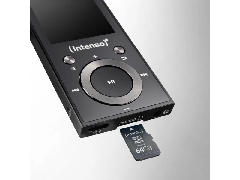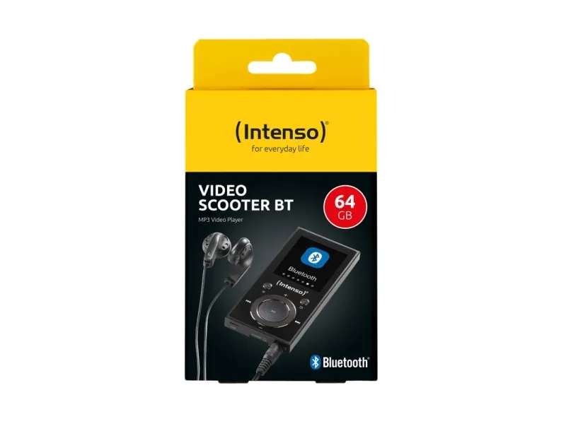 The Intenso Video Scooter BT is a compact all-rounder for music and video enthusiasts. With 64 GB of storage, it provides enough space for extensive media libraries. Thanks to Bluetooth 5.0 technology, you can easily connect wireless headphones or speakers. The 1.8" LCD display ensures clear visibility of your files, while folder navigation makes browsing intuitive. Supporting various formats like MP3, WMA, AVI and AMV, the player also offers eight equaliser and playback modes for a personalised experience. Its 18-hour battery life and lightweight 28 g design make it perfect for travel or everyday use. Complete with microSD card, USB-C cable, headphones and conversion software.Intenso Video Scooter BT MP3 Player 64 GB – Bluetooth 5.0, 1.8" LCD Display, USB-C, microSD Card Reader, 18 hrs Battery Life, Music & Video Player, Black. Type: MP4 player. Total storage capacity: 64 GB. Display: LCD. Card reader integrated. Continuous audio playback time: 18 h. Product colour: Black. Headphones included