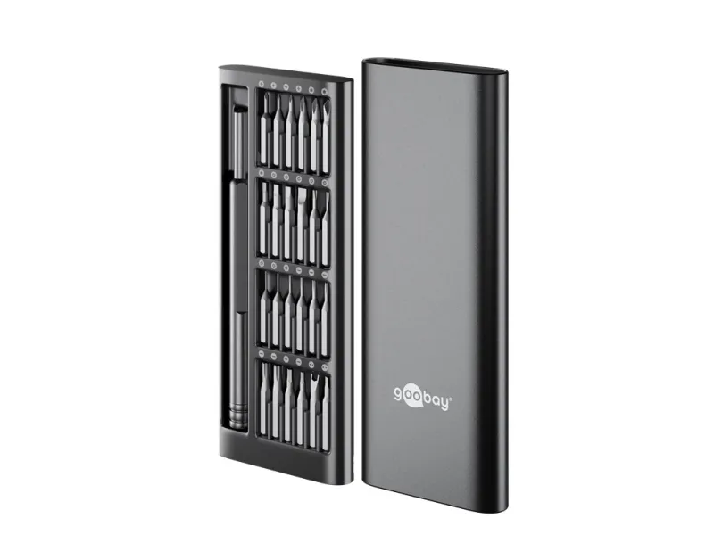 24× H4 48 mm bits, förvaringslåda, magnetiserare/demagnetiserare, Skruvmejselhandtag med magnetisk hållare