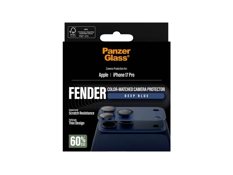 Defend your brand-new iPhone with the Fender camera protector. This camera protector from PanzerGlass designed and color-matched specifically for iPhone 17 & 17 Pro Max provides a stylish and robust defense against life's bumps and bruises. The strikingly thin yet incredibly strong lens guard provides maximum durability and protection for the entire camera plateau. In fact, the matte aluminum house does more than simply protect your lenses, it actually enhances the structural integrity of your entire phone – and in a finish that never fades! It comes in three gorgeous device-matching colors: Silver, Deep Blue, and Cosmic Orange. And, of course, installation is a breeze, guaranteeing a perfect fit. Color-matched Fender from PanzerGlass defends your phone with enhanced camera protection that is truly unique, truly you.