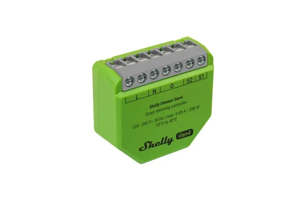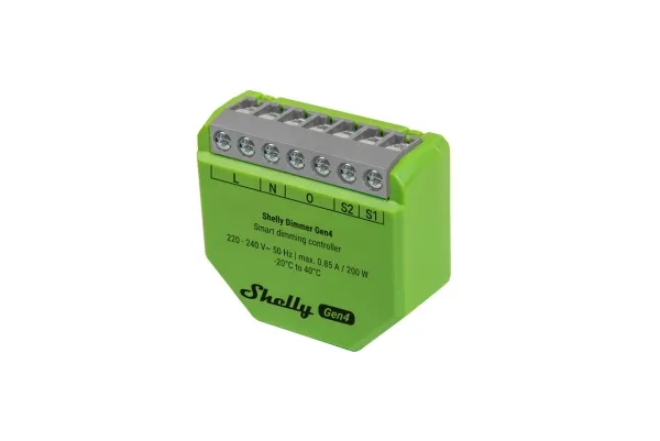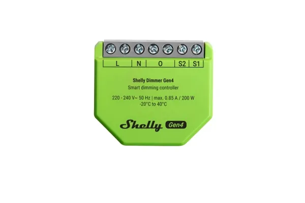The Shelly Dimmer Gen4 is an advanced in-wall smart dimmer that supports Wi-Fi, Zigbee, and Bluetooth pairing, while also being Matter-compatible via Wi-Fi. Designed for flexibility and ease of integration, it delivers precise lighting control without the need for a neutral wire, making it ideal for both new builds and retrofits. Key Features: No Neutral Required: Operates without a neutral wire (requires minimum 20W load or bypass module). Tri-Protocol Support: Communicates via Wi-Fi, Zigbee, and Bluetooth—ideal for hybrid smart home systems. Matter Certified: Fully Matter-compatible over Wi-Fi, ensuring seamless integration with Apple HomeKit and other Matter-enabled platforms. Compact Design: Fits behind switches or light fixtures in standard wall/ceiling boxes. Easy Bluetooth Pairing: Pair directly with battery-powered switches using Bluetooth—no app or Wi-Fi required. Automatic Dimming Calibration: Automatically detects and applies the optimal dimming method. Power Monitoring: Built-in meter tracks real-time energy usage through the Shelly Smart Control app. Customizable Controls: Set minimum/maximum brightness, dimming speed, and fade time. Dual Switch Inputs: Fully programmable, works with both momentary and toggle switches. Built-in Timer Function: Includes stairwell lighting automation. Advanced Scheduling: Create time-based routines or use sunrise/sunset triggers (astro timer). Supported Load Types: Dimmable LED bulbs: up to 150 W, Incandescent and halogen bulbs: up to 200 W, Iron-core transformers with low-voltage bulbs: up to 200 VA, Dimmable electronic transformers: up to 200 W. Compatible with over 200 platforms, including: Google Home, Amazon Alexa, Apple HomeKit (via Matter), Home Assistant, SmartThings, Homey, KNX, …and many more. Connectivity and Security: Connects to 2.4 GHz Wi-Fi, Built-in Bluetooth for quick pairing and gateway functionality with Shelly BLU devices, Operates fully offline, no cloud required, Supports MQTT, HTTP, and WebSocket with TLS encryption. Why Choose Shelly Dimmer Gen4? Shelly Dimmer Gen4 is built for professionals and smart home enthusiasts alike. Whether you're modernizing an old switch or integrating with high-end automation systems, this dimmer delivers unmatched flexibility, Matter support, and top-tier local control. Shelly Dimmer Gen4 – Universal dimming, powerful integration, no compromises.