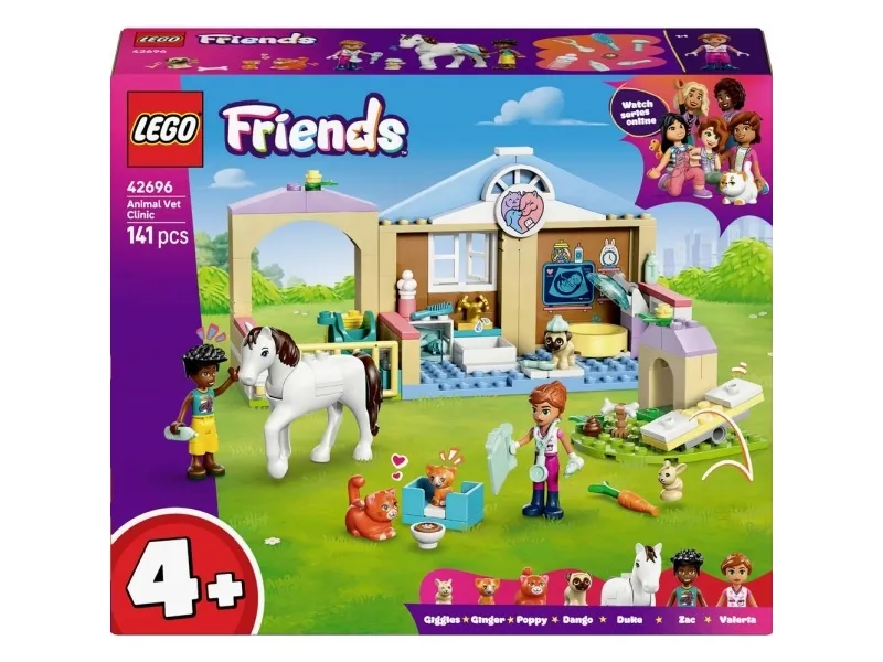 LEGO® Friends Eläinlääkäriasema (42696) leikkisetin parissa yli 4-vuotiaat lapset voivat keksiä ikiomia tarinoita. Yksityiskohtainen eläinlääkäriaiheinen leikkisetti sisältää kaiken, mitä alle kouluikäiset tarvitsevat eläinaiheisiin hoiva‑ ja roolileikkeihin. Setissä on hevostalli, tutkimushuone, lemmikkien sänkyjä, ruokatarvikkeita, eläinlääkärin välineitä, lemmikkien leikkipaikka ja paljon muuta.