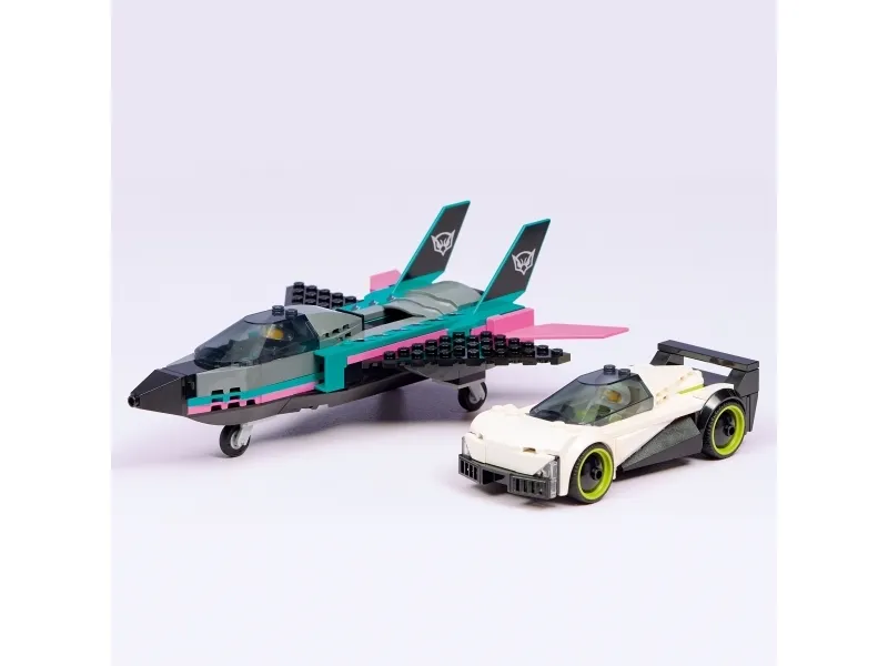 2. PAKKAUKSEN SISÄLTÖ – Lapset voivat rakentaa superauton ja suihkukoneen, ja mukana on myös sekä lentäjän ja kuljettajan minihahmot huikeita kisaseikkailuja varten