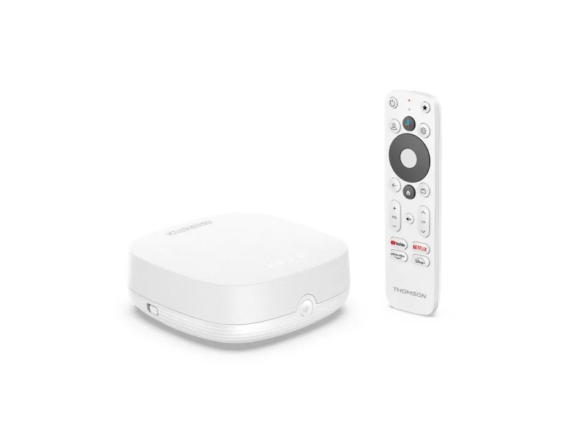 THOMSON Streaming Box Plus is designed to bring the ultimate cinematic atmosphere to your living room at a competitive price. With stunning 4K Ultra HD resolution, Dolby Vision, and immersive Dolby Atmos sound, every movie night will feel like a theatre experience. Powered by a high-performance Amlogic Quad-core Cortex-A55 processor, 3GB of RAM, and 32GB of storage, this streaming box delivers seamless performance and fast response times. Running on the Google TV OS, it provides access to over 400,000 movies, shows, apps, and live TV channels, ensuring endless, personalised entertainment at your fingertips. Enjoy built-in Google Cast to stream content from compatible smart devices directly to your TV. The THOMSON Streaming Box Plus also offers thoughtful upgrades such as a Far-field Voice Assistant and Find My Remote feature. Speak to your device from anywhere in the room and control your TV hands-free. The built-in microphones, certified for Google Assistant, ensure voice-controlled convenience. It even includes a built-in speaker, ready to respond to your questions and requests. With the Find My Remote function, you'll never worry about losing the remote again — simply press the button on the box, and the remote will emit a loud sound, making it easy to locate. For advanced connectivity, the box includes HDMI for 4K streaming, USB 3.0, Ethernet, and Wi-Fi 6 support, ensuring smooth, high-speed streaming, even on busy networks. The ergonomic remote control allows for quick access to your favourite apps via the customisable Star button or dedicated keys for Netflix, Disney+, YouTube, and Prime Video.Thomson BOX PLUS 270G. Processor manufacturer: ARM, Processor architecture: Cortex-A55. Internal memory: 3000 MB, Internal memory type: LPDDR4. Internal storage capacity: 32 GB, Storage media type: Flash. Graphics card: Mali G31-MP2. Operating system installed: Android, Video apps: Amazon Prime Video, Apple TV, Disney+, Netflix, YouTube, Music apps: Spotify