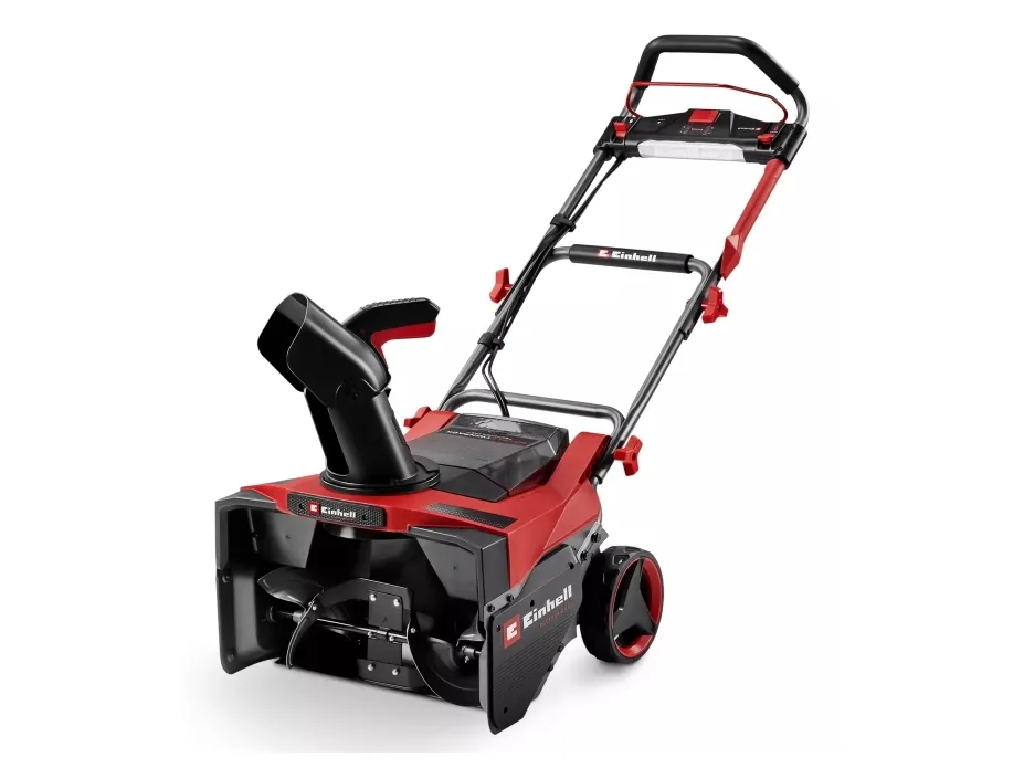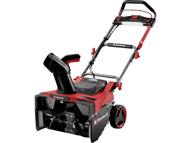 The Einhell Professional snow blower GP-ST 36/53 Li E BL-Solo is the perfect help when clearing snow – whether in the driveway or on the pavement. As a member of the Power X-Change family, any battery and charger can be used with this snow blower. The Double Twin-Pack technology provides 4 batteries, 2 of which are in use at the same time, which ensures double the running time and more power. The tool is powered by an Einhell Brushless motor. This brushless motor provides more power and longer runtimes than a conventional carbon brush motor. Once you register online, there is a 10-year warranty on the Brushless motor. The Professional cordless snow blower works with a 53-cm-wide roller made of durable metal. It clears fresh snow up to heights of 33 cm and can eject it up to 8 m high. The ejection chute can be electrically adjusted between +/- 220° via a slider on the guide bar. The upper part of the chute can be adjusted manually to determine the ejection angle or ejection height up to a maximum of 8 m. The speed can also be continually adjusted electronically via a slider on the handle, depending on the snow condition. A practical LED battery level indicator on the push bar shows the current charging level of the batteries at all times. In addition, a built-in LED strip on the handle can be switched on and off separately at the push of a button. The guide bar can be folded up for space-saving storage. The ergonomic handle with soft grip has a 2-point safety switch to prevent unintentional starting. Frozen snow can be removed from the snow ejection chute using the practical cleaning spatula, which can be stowed away on the guide bar. The Professional cordless snow blow comes without a battery or charger. These are available separately, for example as a convenient starter kit.