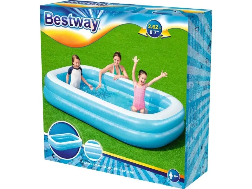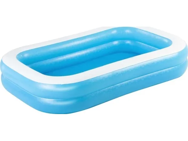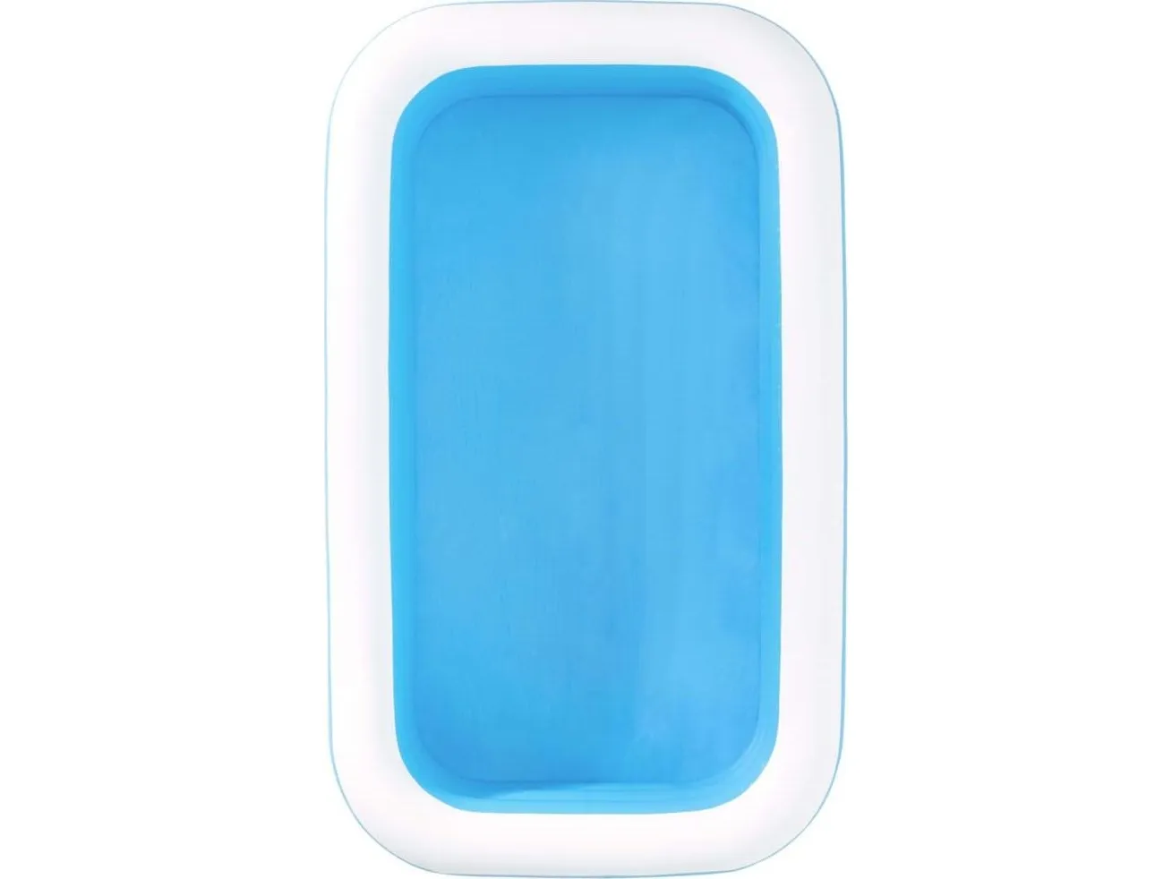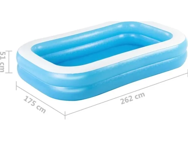 BLUE RECTANGULAR FAMILY POOL - Two 3 interconnecting nozzles - Sturdy pre-tested vinyl - 2 equal rings - Sturdy I-beam construction - Extra wide side walls - Heavy-duty repair patch included - Designed water capacity: 450 L 119 gal.) - Releases pool water with the easy-to-use drain valve! Contents: One pool, repair patch