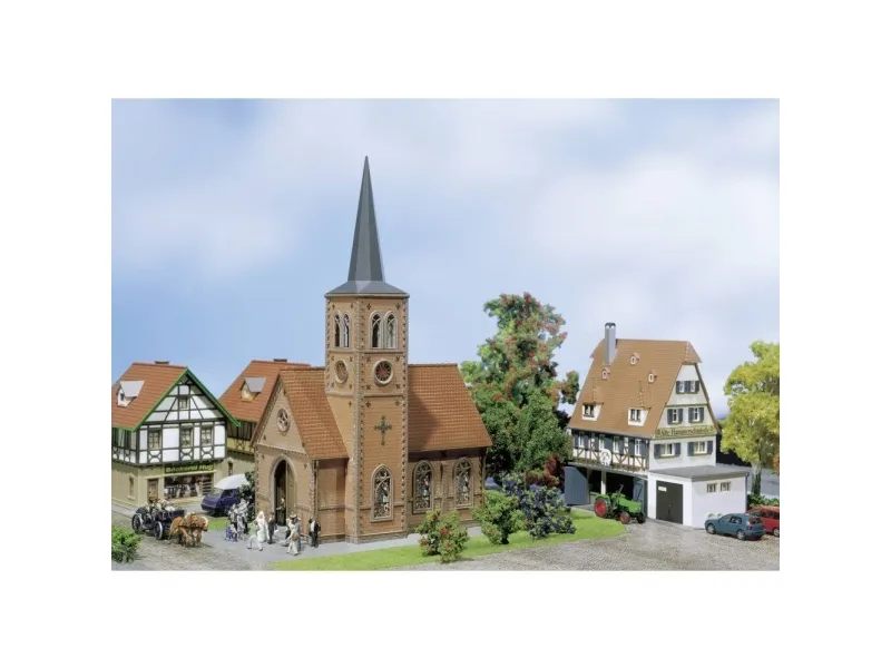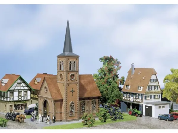 H0 town & village buildingsKaksivärinen tiilirakennus, kirkkaan väriset kirkon ikkunat, kapea teräväkärkinen lakki, suuri kivireliefi takana ja erilaisia osia koristeeksi. Tyypillinen pohjoismainen rakennus. Rakennussarja sisältää: 50 osaa 5 värissä, ikkunakalvo, 1 verho ja 1 rakennusohje.