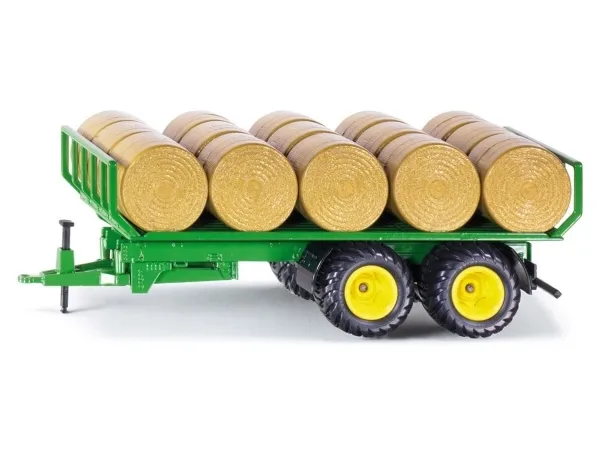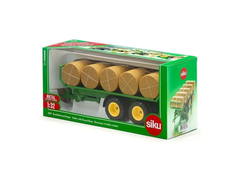 Detailed trailer for round bales incl. 15 hay bales, For playing and attaching to all siku toy vehicles and tractors at a 1:32 scale. A wide range of features: Metal support for stability, Rear hitch accommodates an additional trailer. Excellent addition to SIKU Farmer tractors of the same scale. Scale: 1:32, Material: metal/plastic, Dimensions: 27 x 8.6 x 9.4 cm.