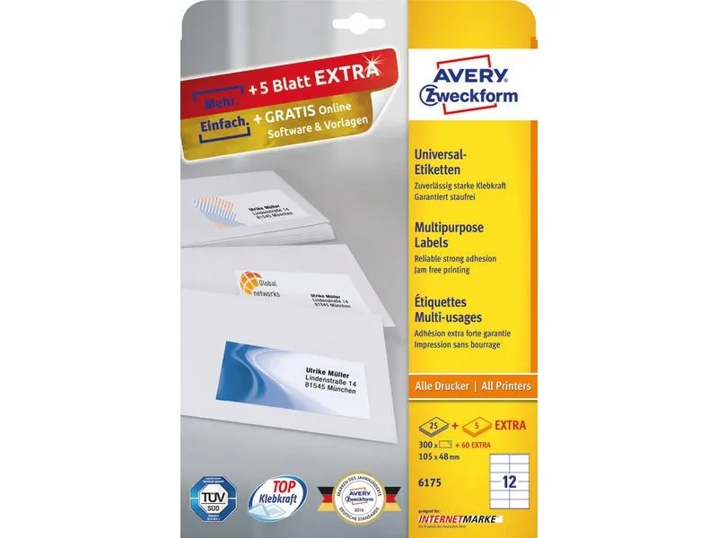 Avery 6175, Valkoinen, Suorakulmio, Kiinteä, 105 x 48 mm, A4, Paperi